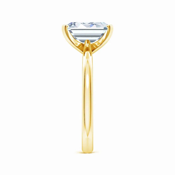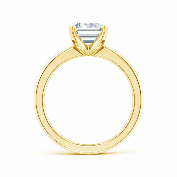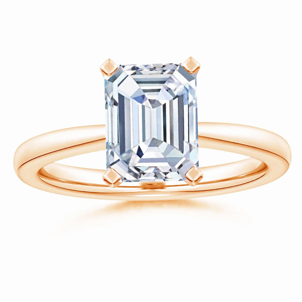 This solitaire engagement ring features a lab-grown emerald cut diamond set in a reverse tapered setting, enhancing the stone’s brilliance and elegance. Crafted with precision, the design offers a modern yet timeless appeal, highlighting the diamond’s clarity and geometric beauty. Ideal for those seeking an ethical and sophisticated choice, this ring combines expert craftsmanship with sustainable luxury.