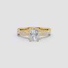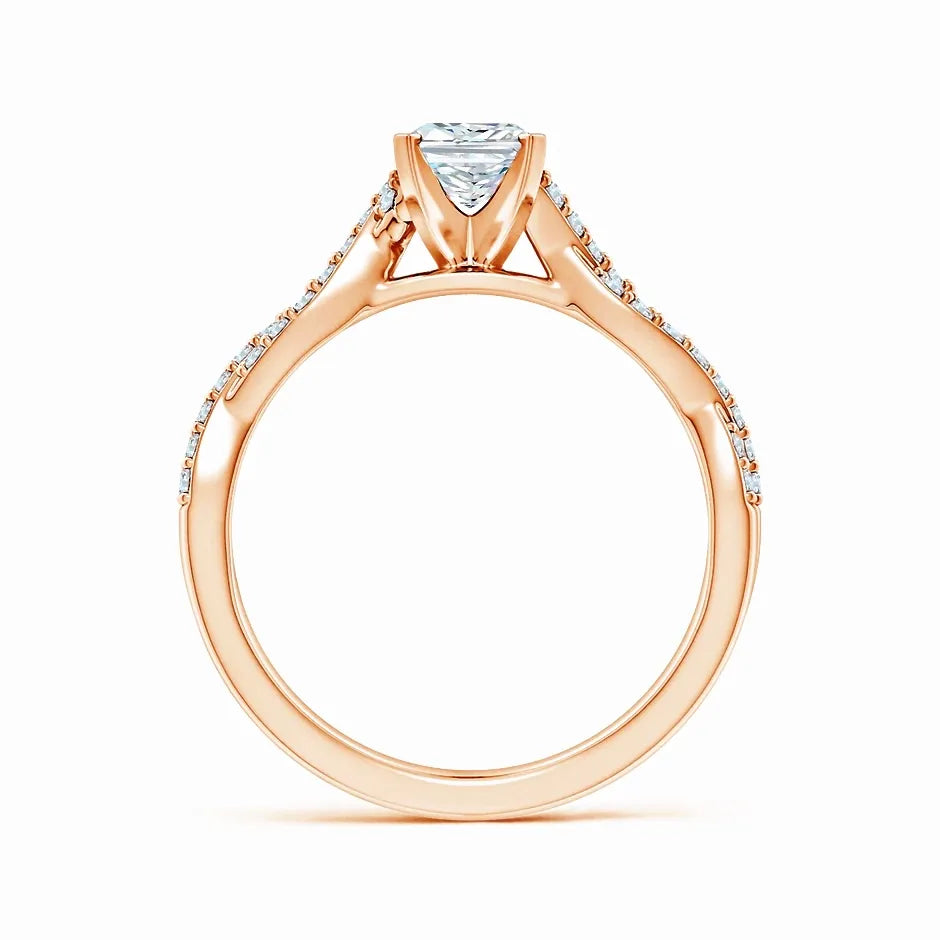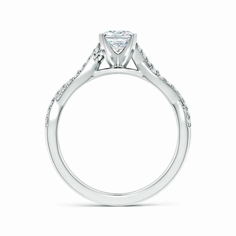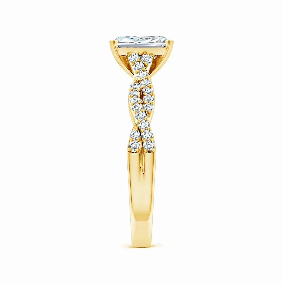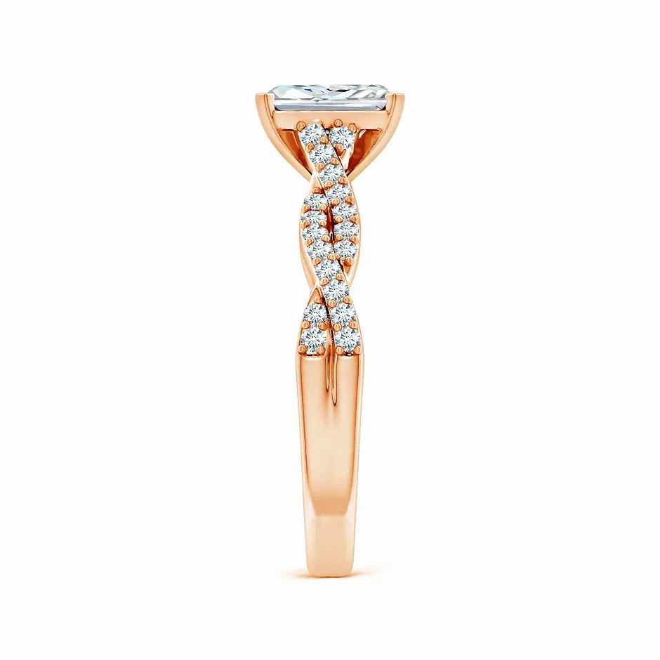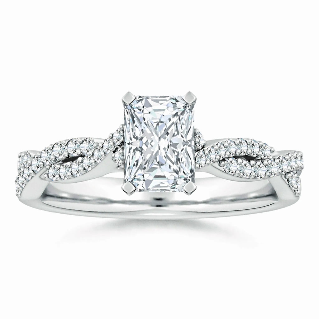 This engagement ring features a lab-grown radiant-cut diamond set in a peg head design, showcasing exceptional brilliance and clarity. The elegant twist shank adds a modern, sophisticated touch while enhancing comfort and durability. Crafted with precision, this ring combines ethical sourcing with timeless style, making it an expert choice for a meaningful symbol of commitment.