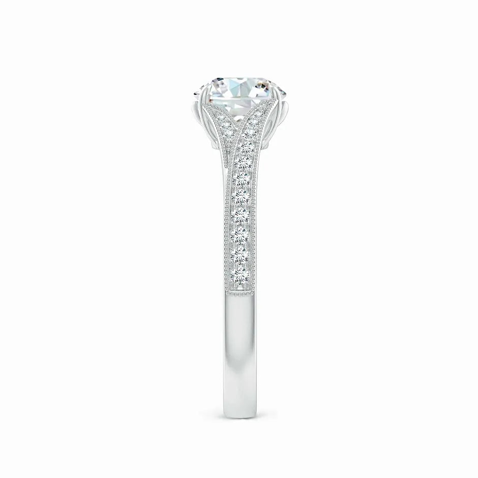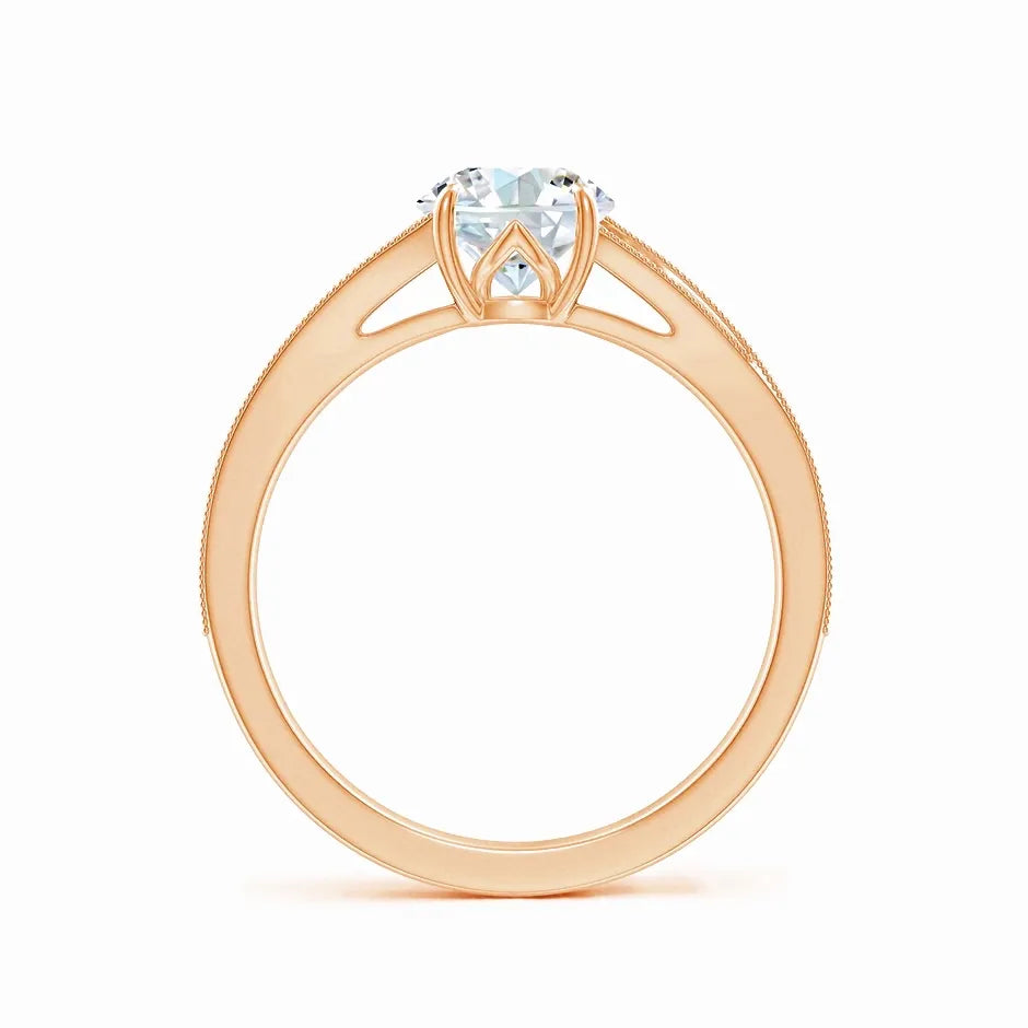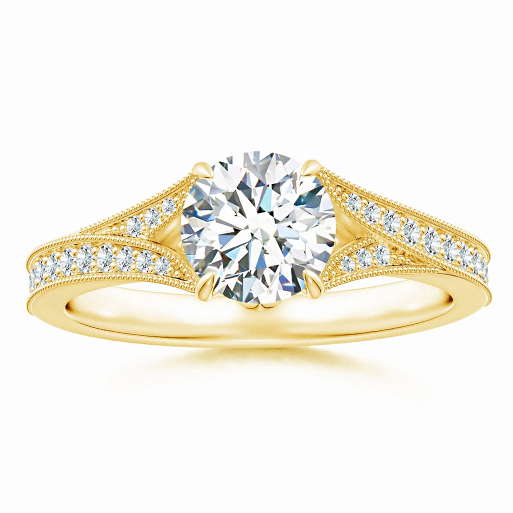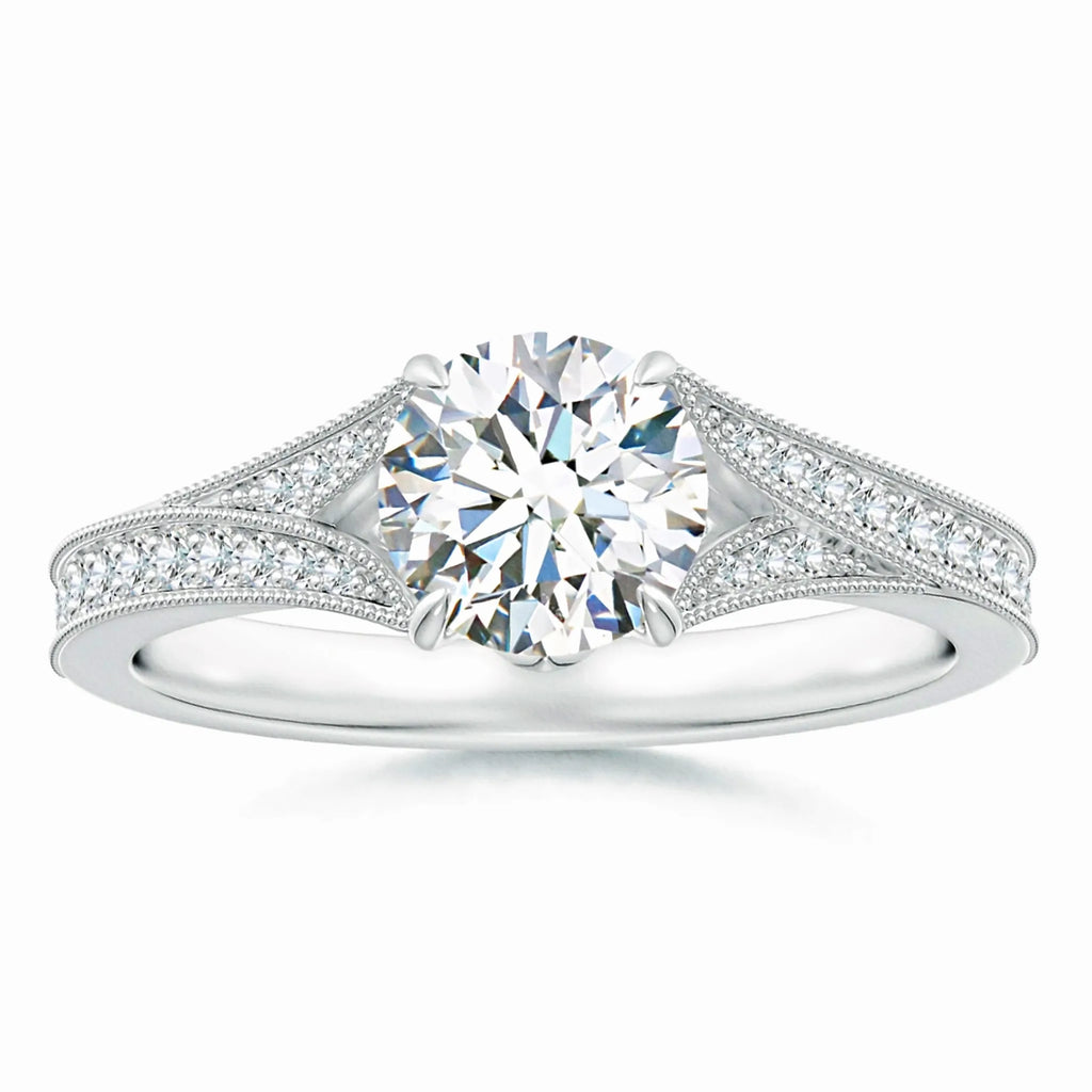 This lab-grown vintage-inspired engagement ring features a brilliant round diamond set on a split shank band, combining classic elegance with modern craftsmanship. The split shank design enhances the diamond’s brilliance while providing a distinctive, timeless look. Crafted with precision, this ring offers an ethical and sustainable choice without compromising on beauty or quality, perfect for those seeking a sophisticated symbol of commitment.