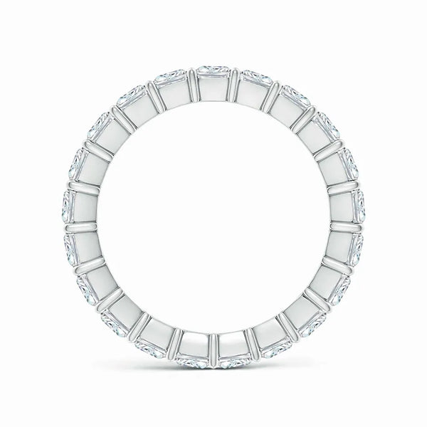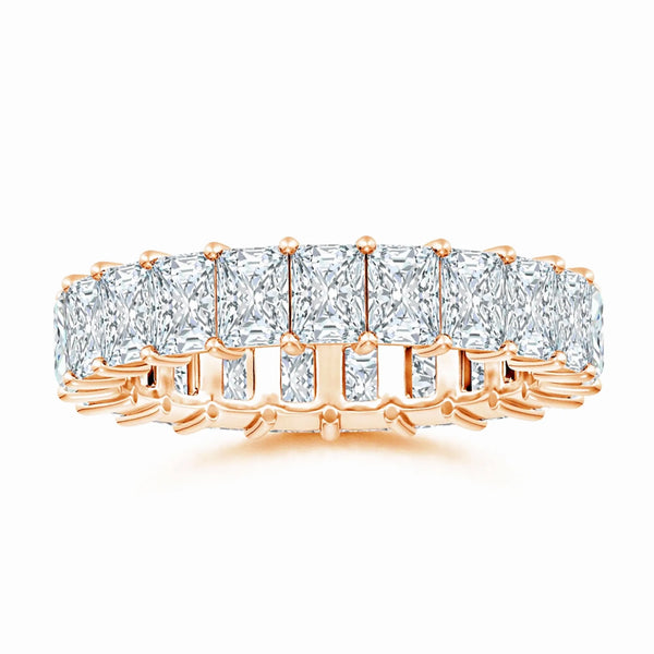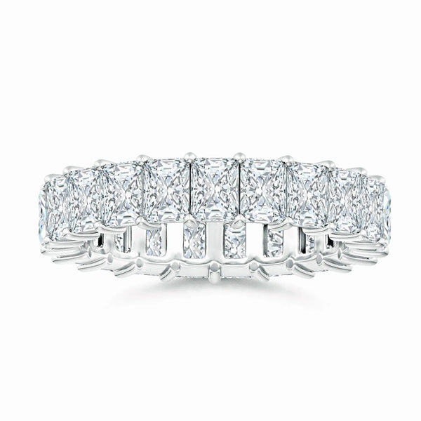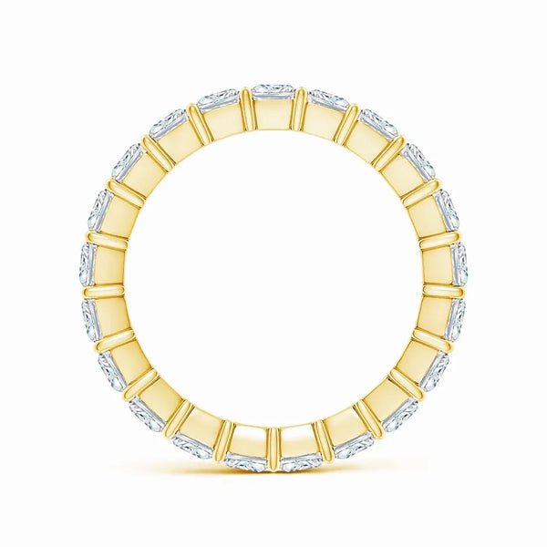 This Lab-Grown North-South Radiant-Cut Diamond Classic Eternity Wedding Ring features precisely aligned radiant-cut diamonds set continuously around the band, symbolizing eternal commitment. Crafted with lab-grown diamonds, it offers exceptional brilliance and ethical sourcing. The north-south orientation of the stones enhances the ring’s modern elegance, making it a refined choice for a timeless wedding band.