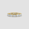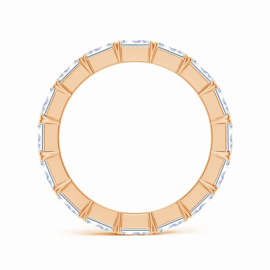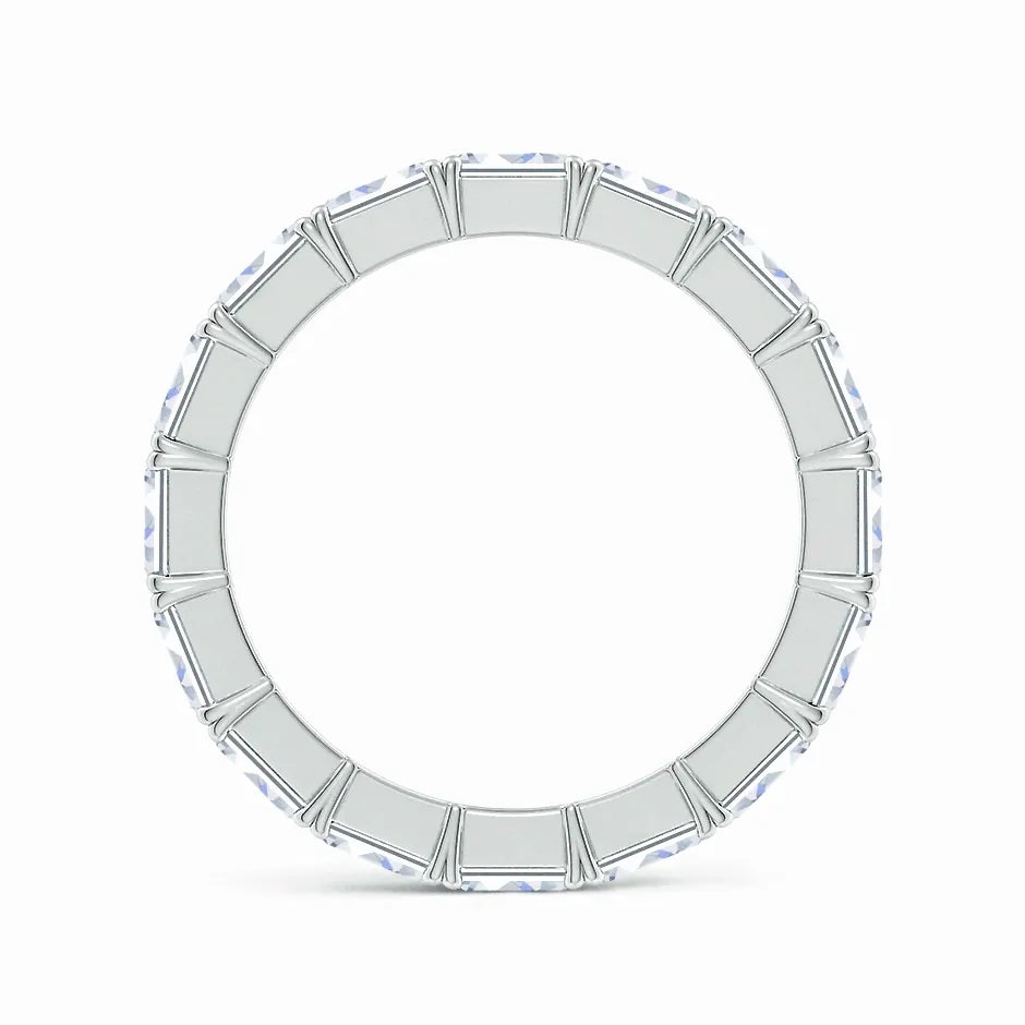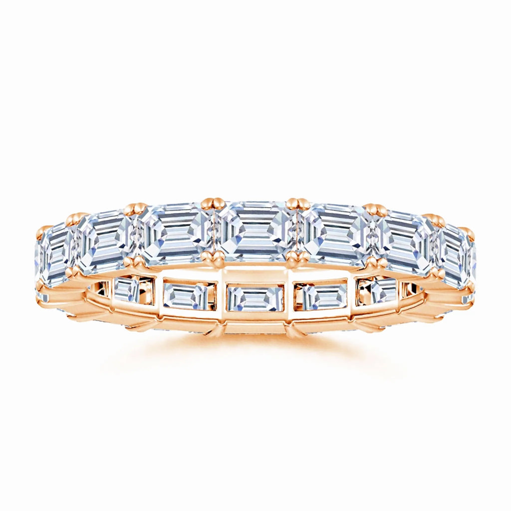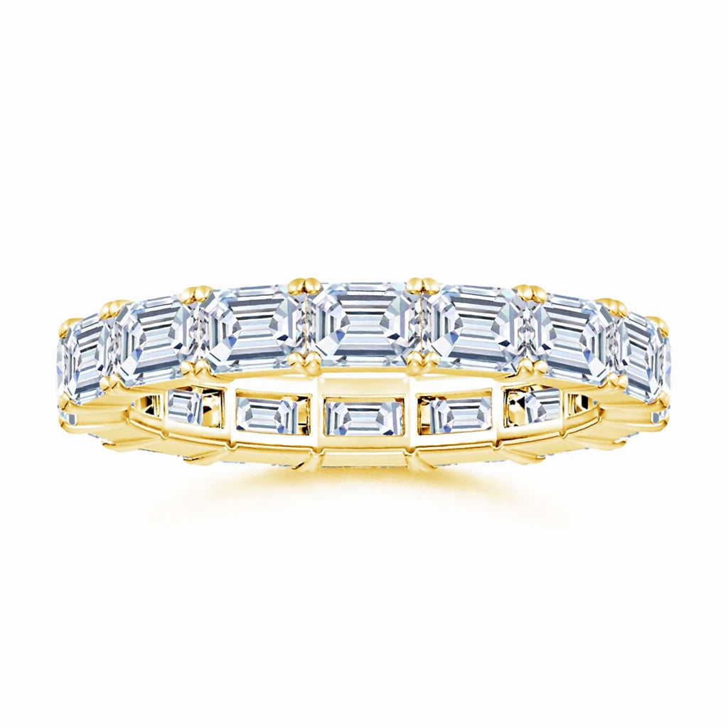This expertly crafted eternity wedding ring features prong-set, emerald-cut lab-grown diamonds arranged in an elegant east-west orientation. The precise setting maximizes the brilliance and clarity of each diamond, offering a modern yet timeless design. Ideal for those seeking sustainable luxury, this ring combines ethical craftsmanship with enduring style, making it a perfect symbol of lifelong commitment.