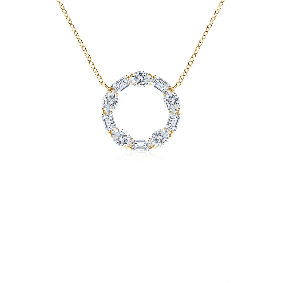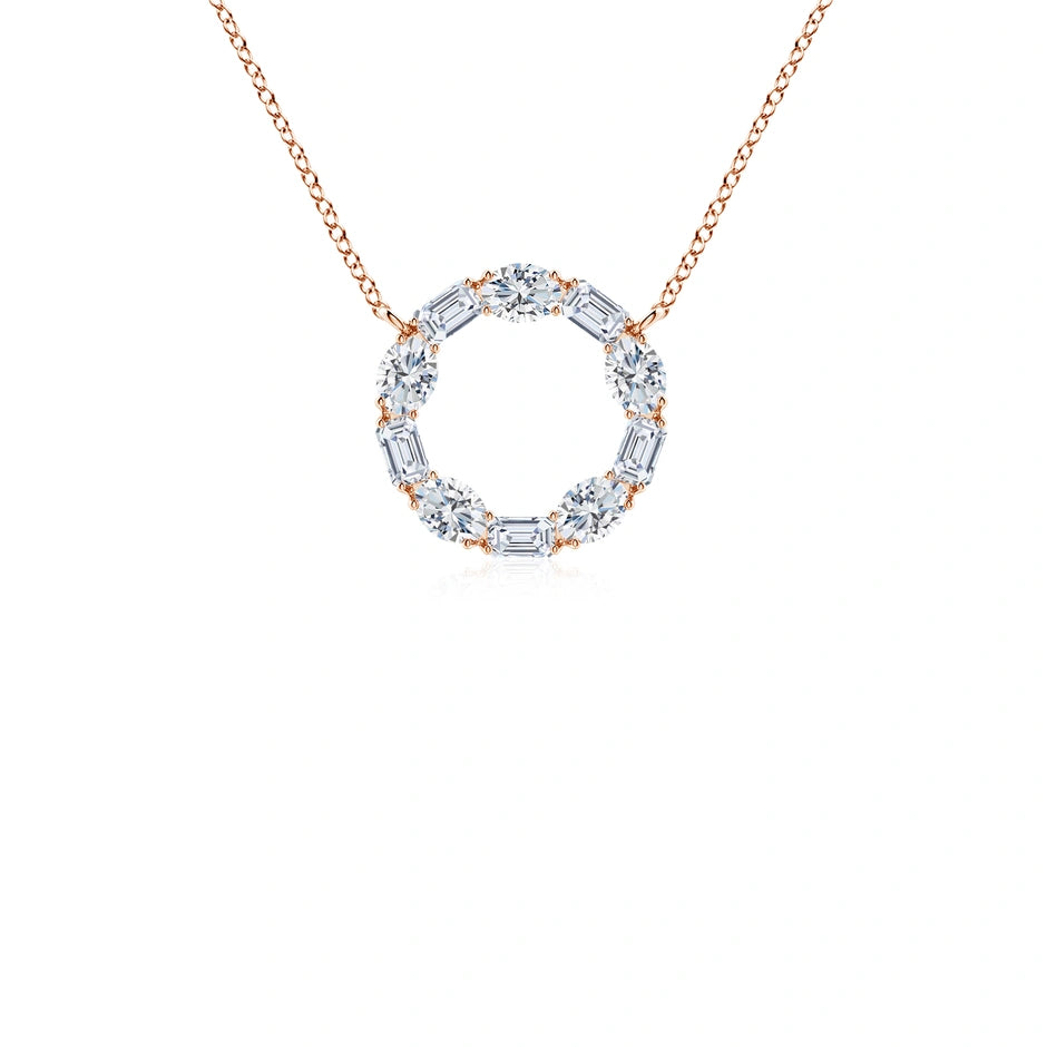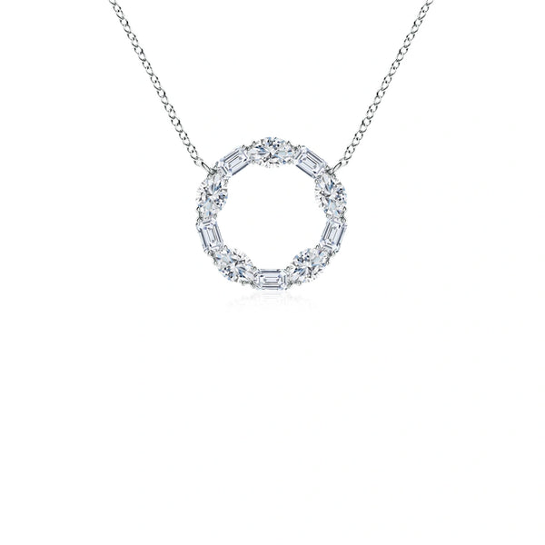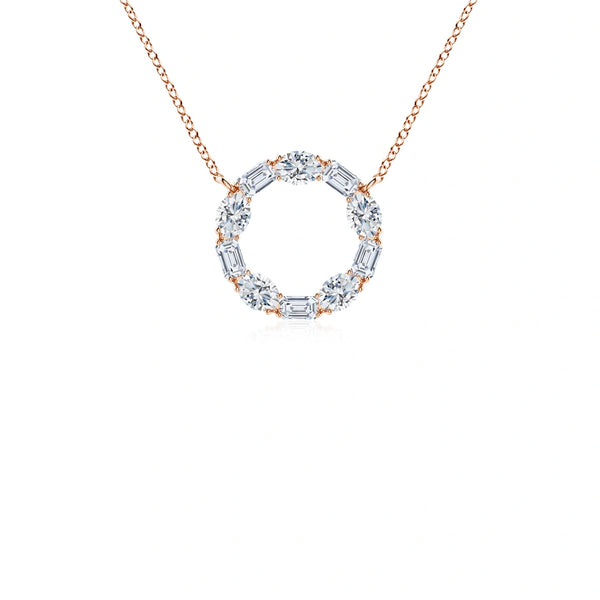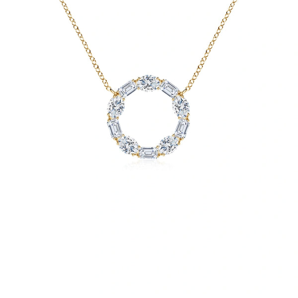 This pendant features a stunning circle of life design, showcasing lab-grown emerald-cut and oval diamonds. Expertly crafted, it combines modern sustainability with timeless elegance. The precise cuts enhance brilliance and clarity, making it a refined choice for those who appreciate ethical luxury and exceptional craftsmanship.