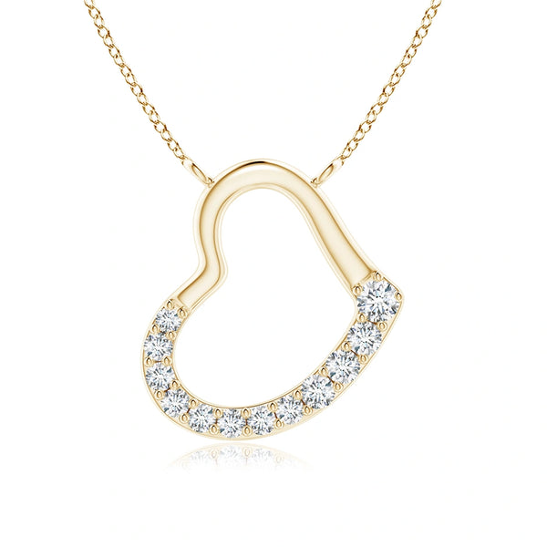 This Lab-Grown Prong-Set Diamond Tilted Heart Pendant features a precisely crafted heart design set at a subtle tilt, showcasing lab-grown diamonds secured by prongs for maximum brilliance and durability. Expertly made, it offers an ethical and sustainable alternative to mined diamonds without compromising on sparkle or quality. Perfect for those seeking a modern yet timeless piece that combines elegance with responsible craftsmanship.