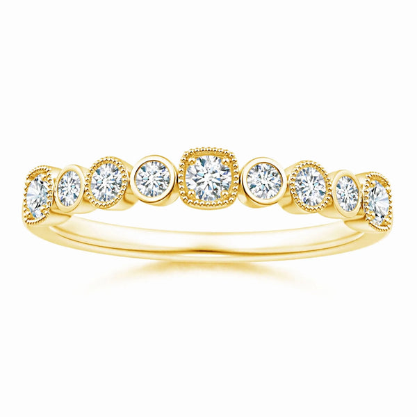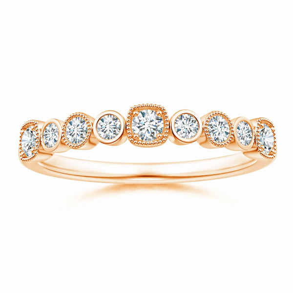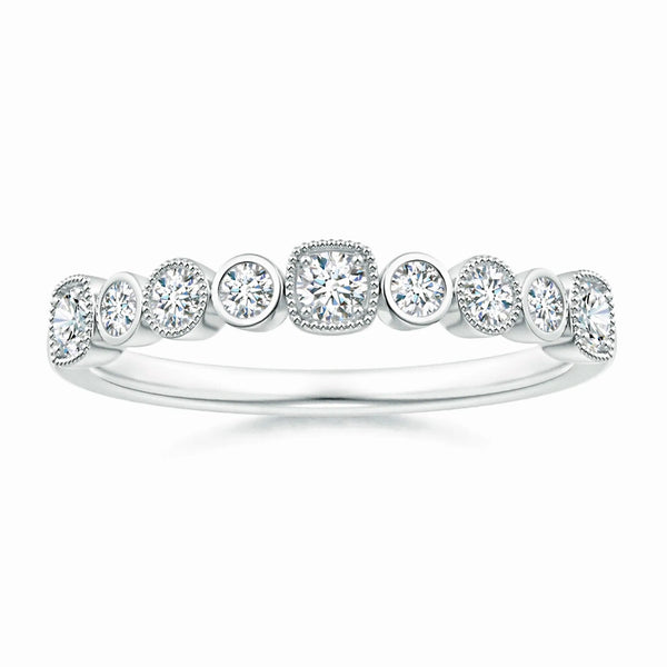 This lab-grown round diamond stackable fashion ring features intricate milgrain detailing, offering a refined and timeless aesthetic. Crafted with precision, it allows for versatile layering with other rings, enhancing your style with sustainable brilliance. Ideal for those seeking elegant, eco-conscious jewelry that combines classic design with modern craftsmanship.