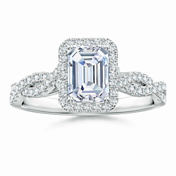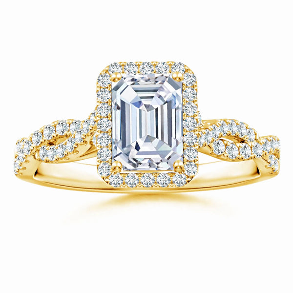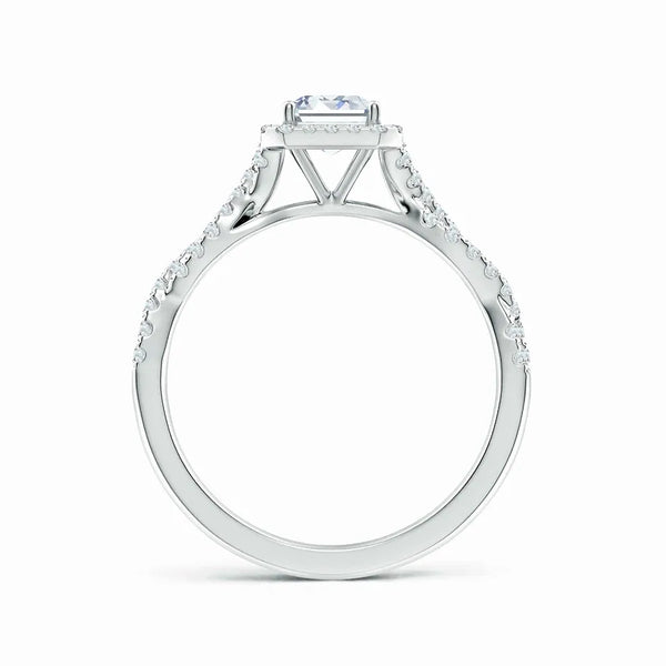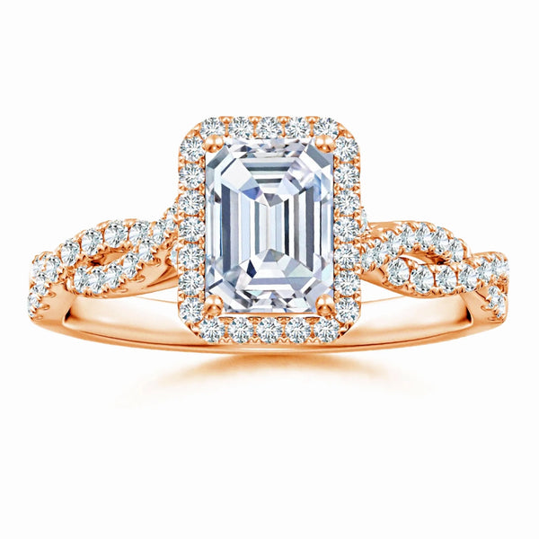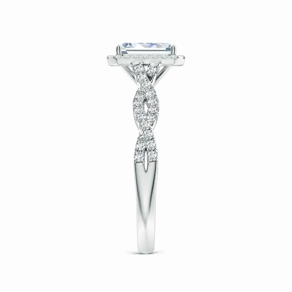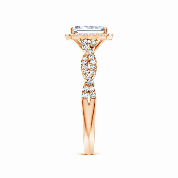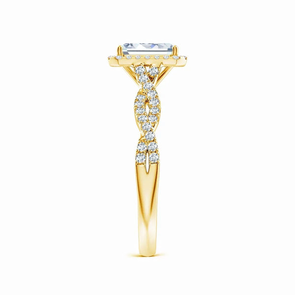 This engagement ring features a stunning lab-grown emerald-cut diamond at its center, surrounded by a delicate halo of smaller diamonds that enhance its brilliance. The twisted shank design adds a modern, elegant twist, symbolizing the intertwining of two lives. Crafted with precision, this ring offers exceptional clarity and sparkle while embracing sustainable and ethical jewelry practices. Ideal for those seeking a timeless yet contemporary expression of commitment.