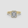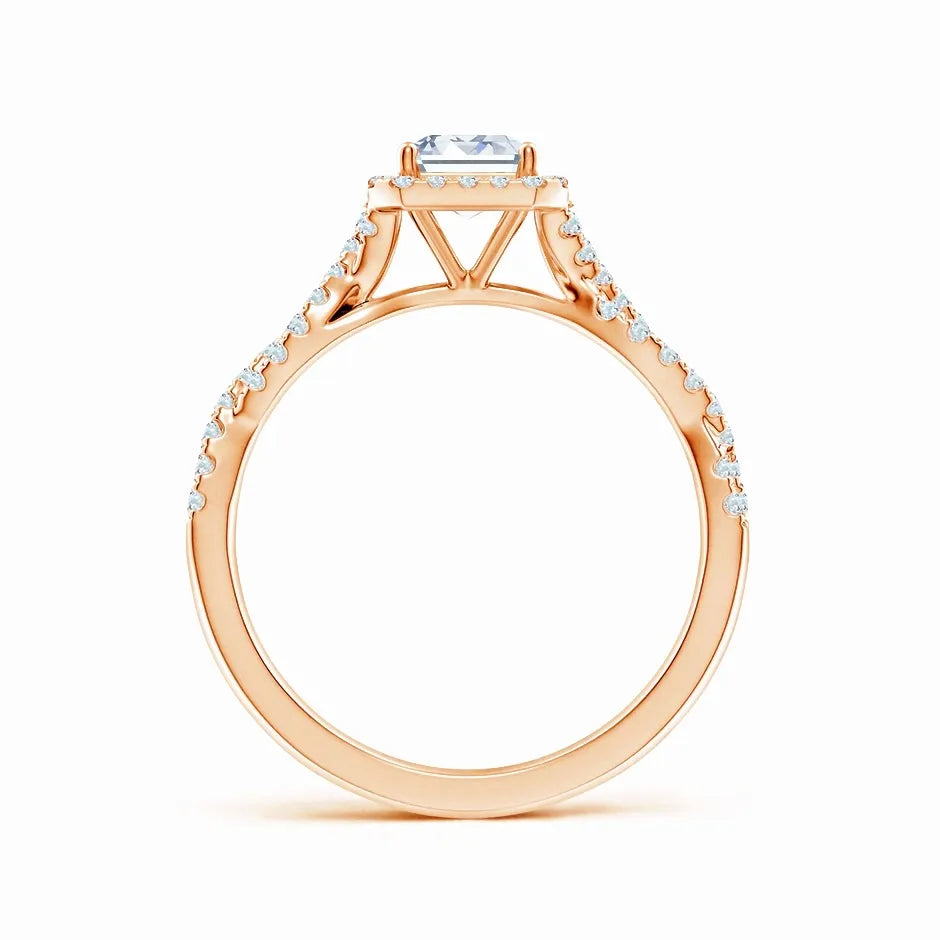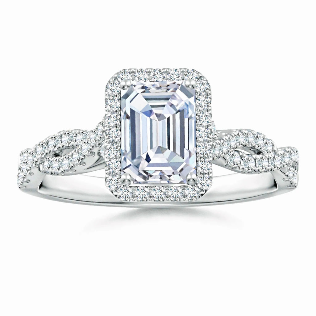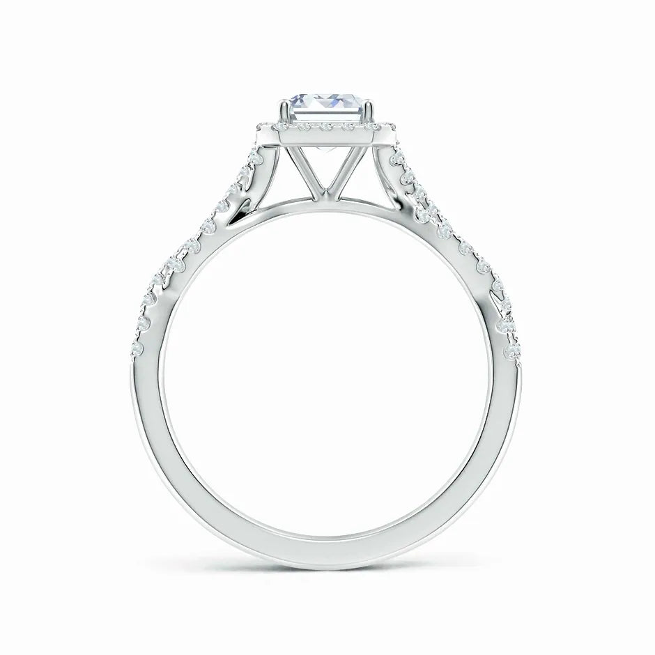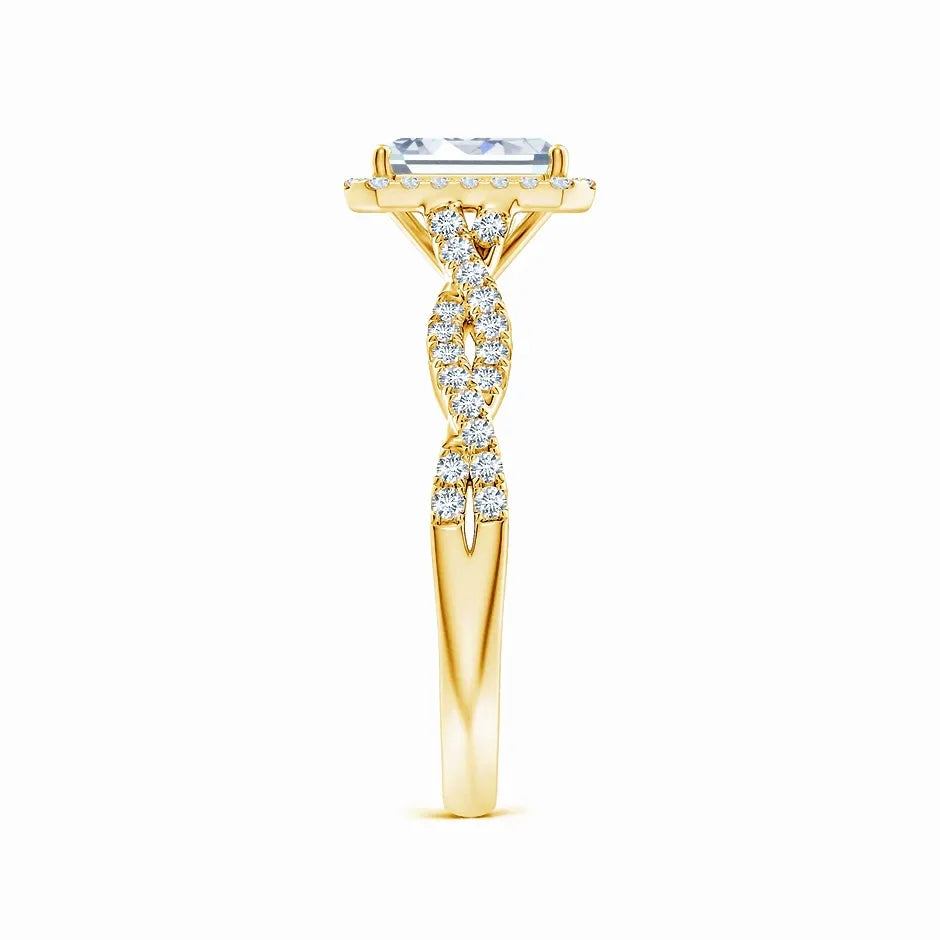 This engagement ring features a stunning lab-grown emerald-cut diamond at its center, surrounded by a delicate halo of smaller diamonds that enhance its brilliance. The twisted shank design adds a modern, elegant twist, symbolizing the intertwining of two lives. Crafted with precision, this ring offers exceptional clarity and sparkle while embracing sustainable and ethical jewelry practices. Ideal for those seeking a timeless yet contemporary expression of commitment.