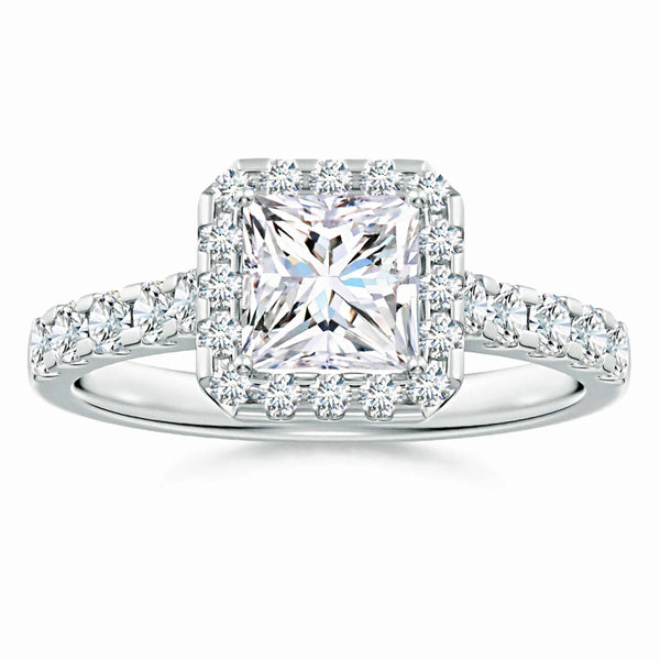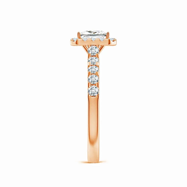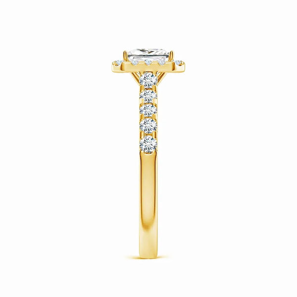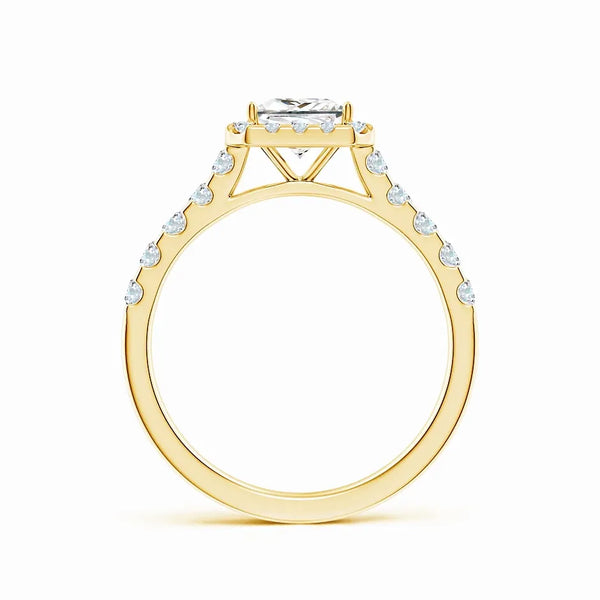 This Lab-Grown Princess-Cut Diamond Halo Engagement Ring features a precisely cut princess diamond at its center, surrounded by a halo of smaller lab-grown diamonds. Crafted with expert precision, it offers exceptional brilliance and ethical sourcing. The halo design enhances the center stone’s sparkle, creating a timeless and elegant symbol of commitment. Ideal for those seeking a sustainable yet luxurious choice, this ring combines modern technology with classic style.