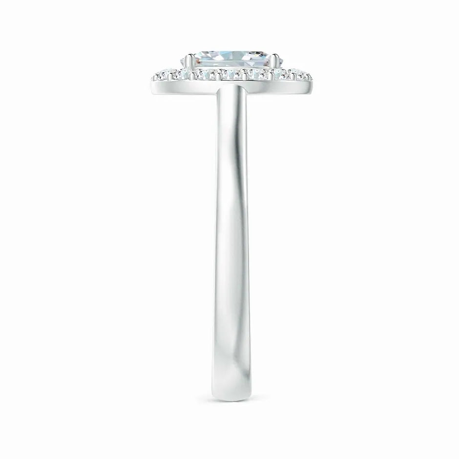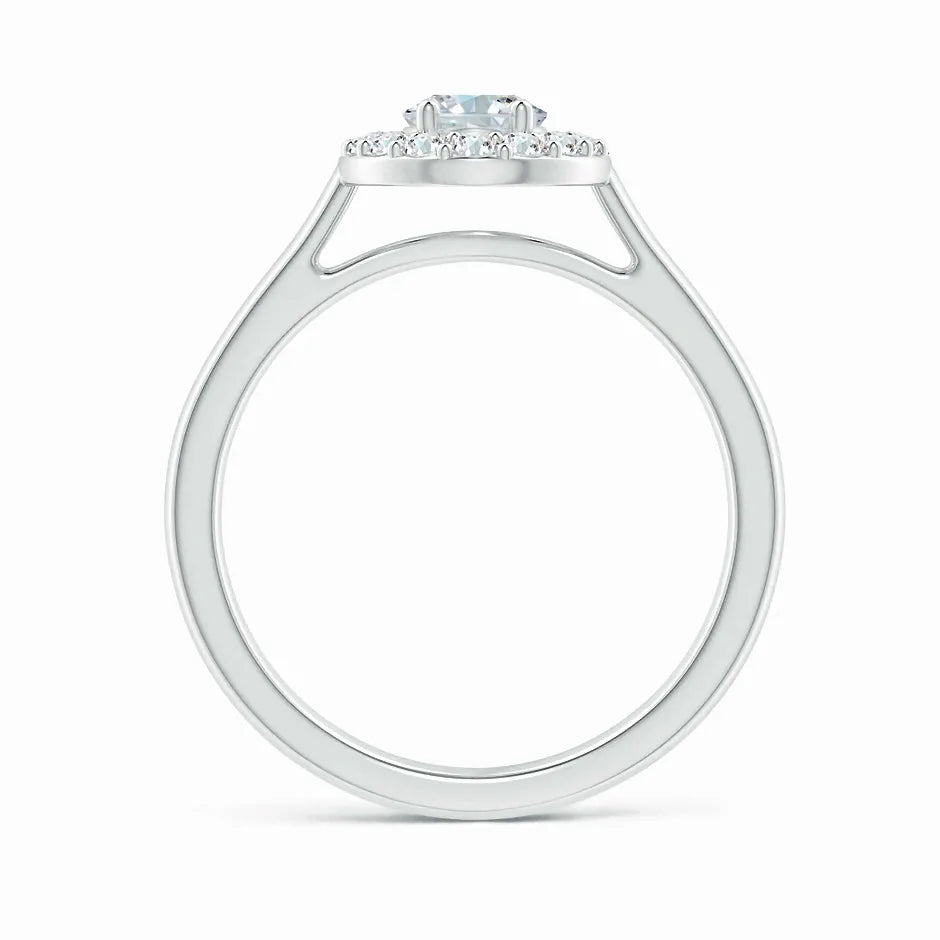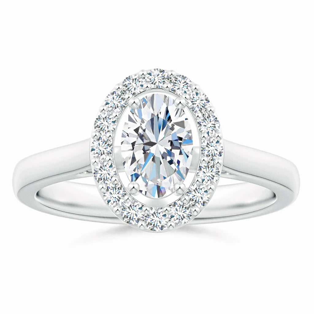 This Prong-Set Oval Lab-Grown Diamond Floating Halo Engagement Ring features a meticulously crafted oval diamond, securely held by prongs to maximize brilliance. The floating halo design enhances the center stone’s sparkle while adding a contemporary elegance. Crafted with sustainable lab-grown diamonds, this ring offers exceptional clarity and ethical appeal, making it a refined choice for a meaningful engagement symbol.