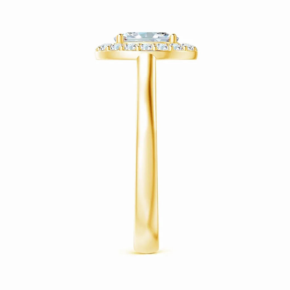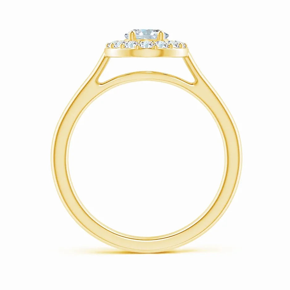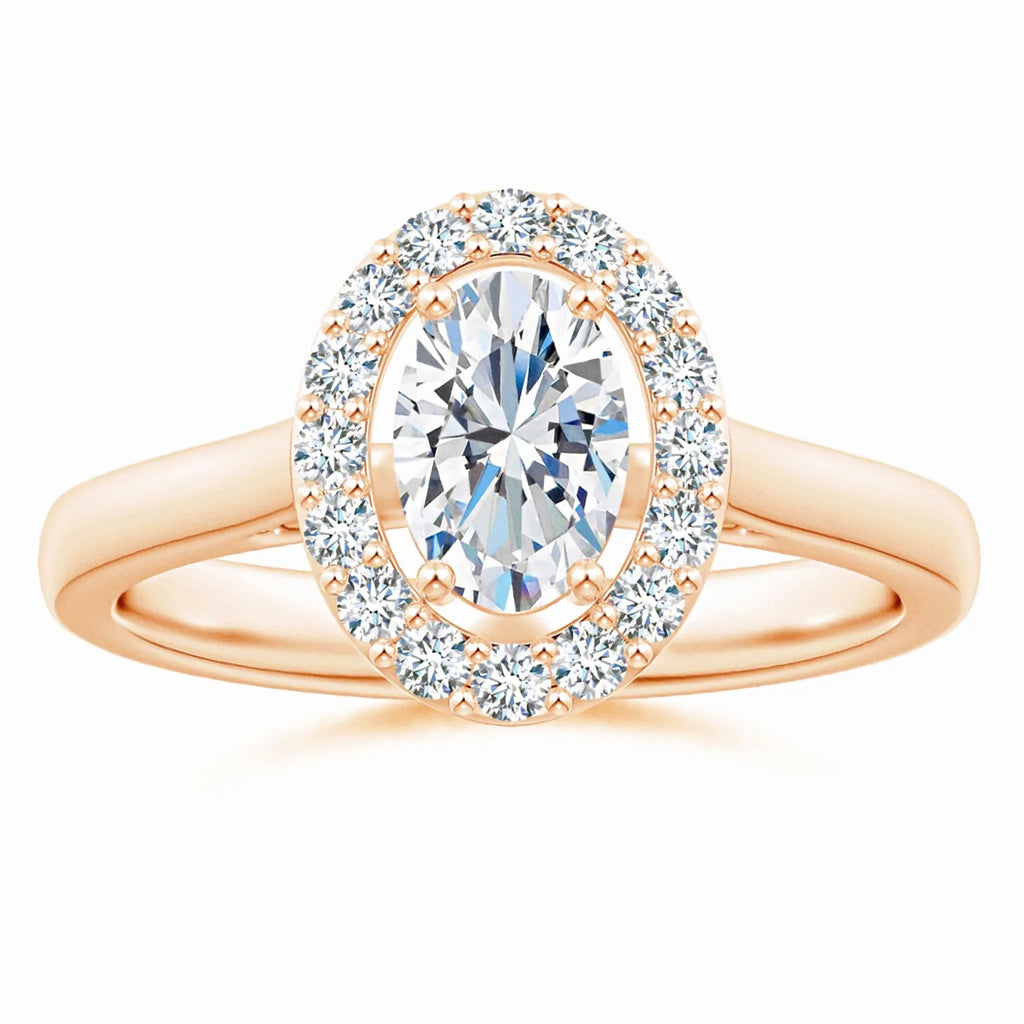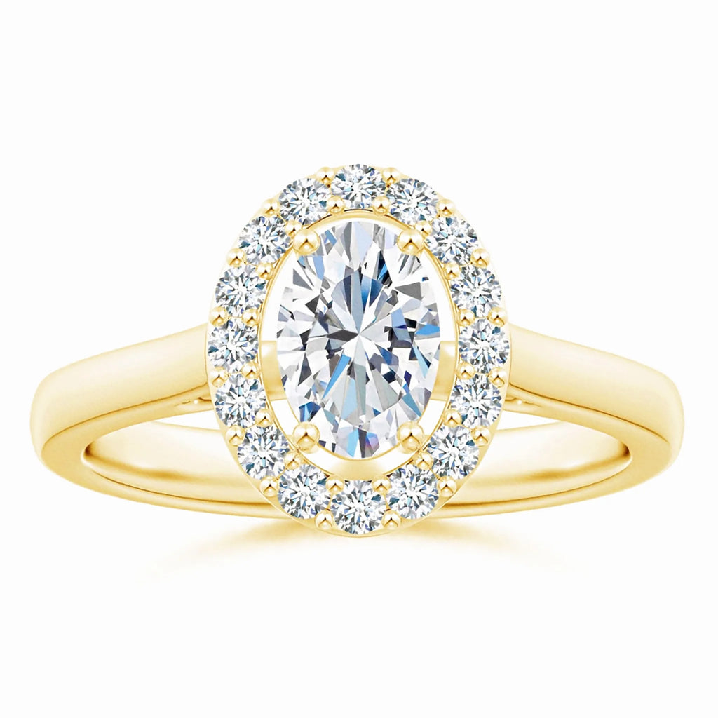 This Prong-Set Oval Lab-Grown Diamond Floating Halo Engagement Ring features a meticulously crafted oval diamond, securely held by prongs to maximize brilliance. The floating halo design enhances the center stone’s sparkle while adding a contemporary elegance. Crafted with sustainable lab-grown diamonds, this ring offers exceptional clarity and ethical appeal, making it a refined choice for a meaningful engagement symbol.