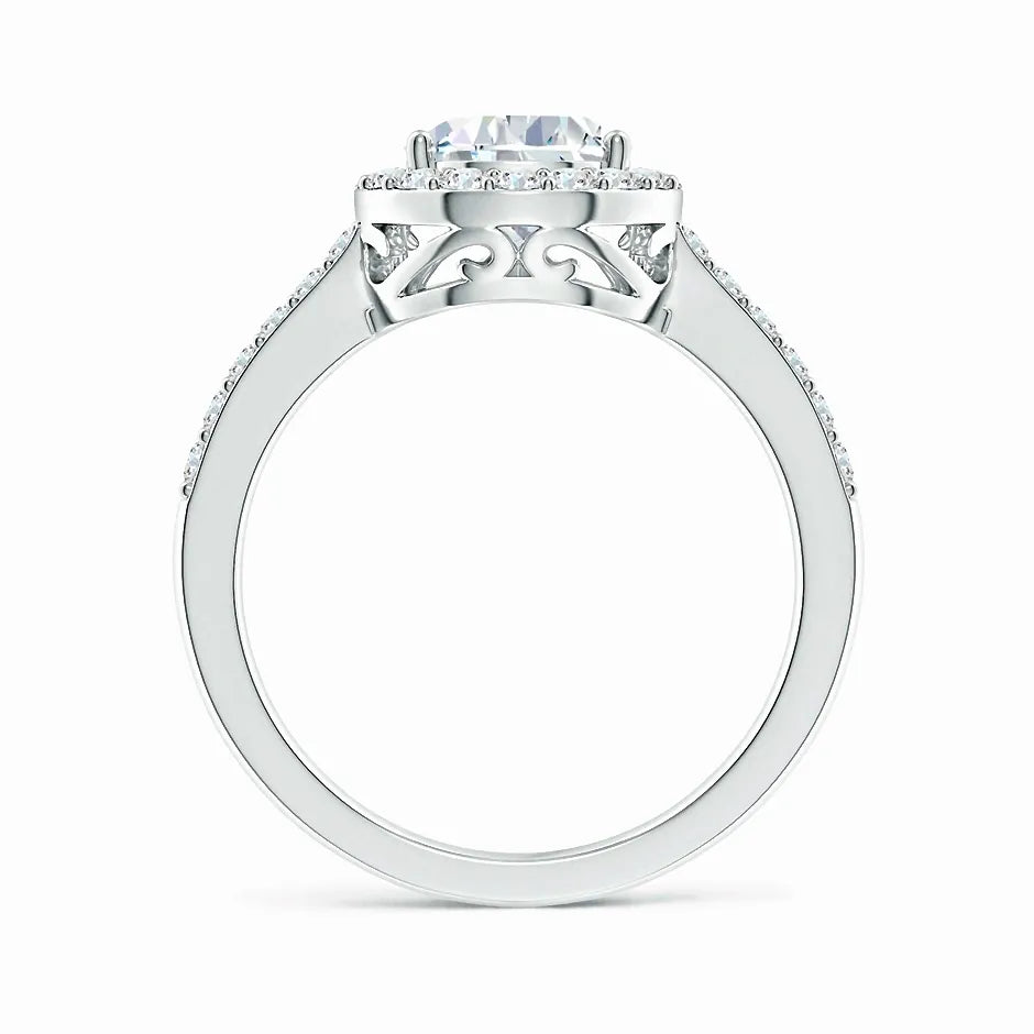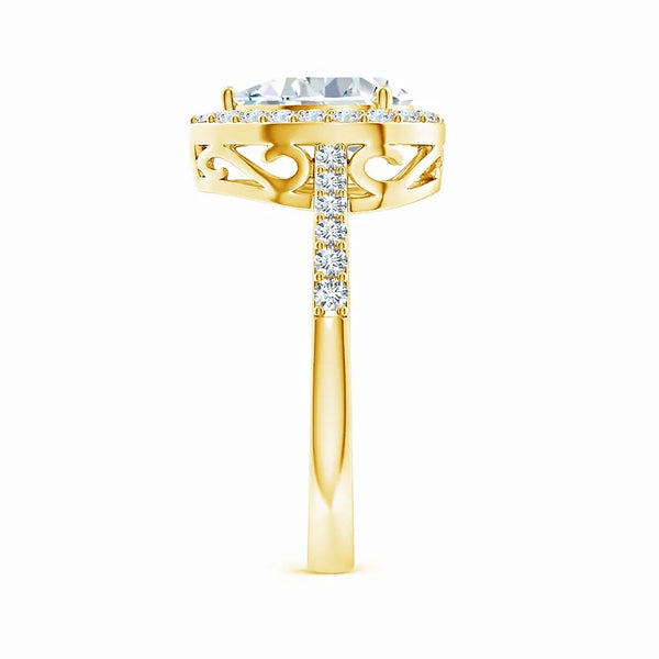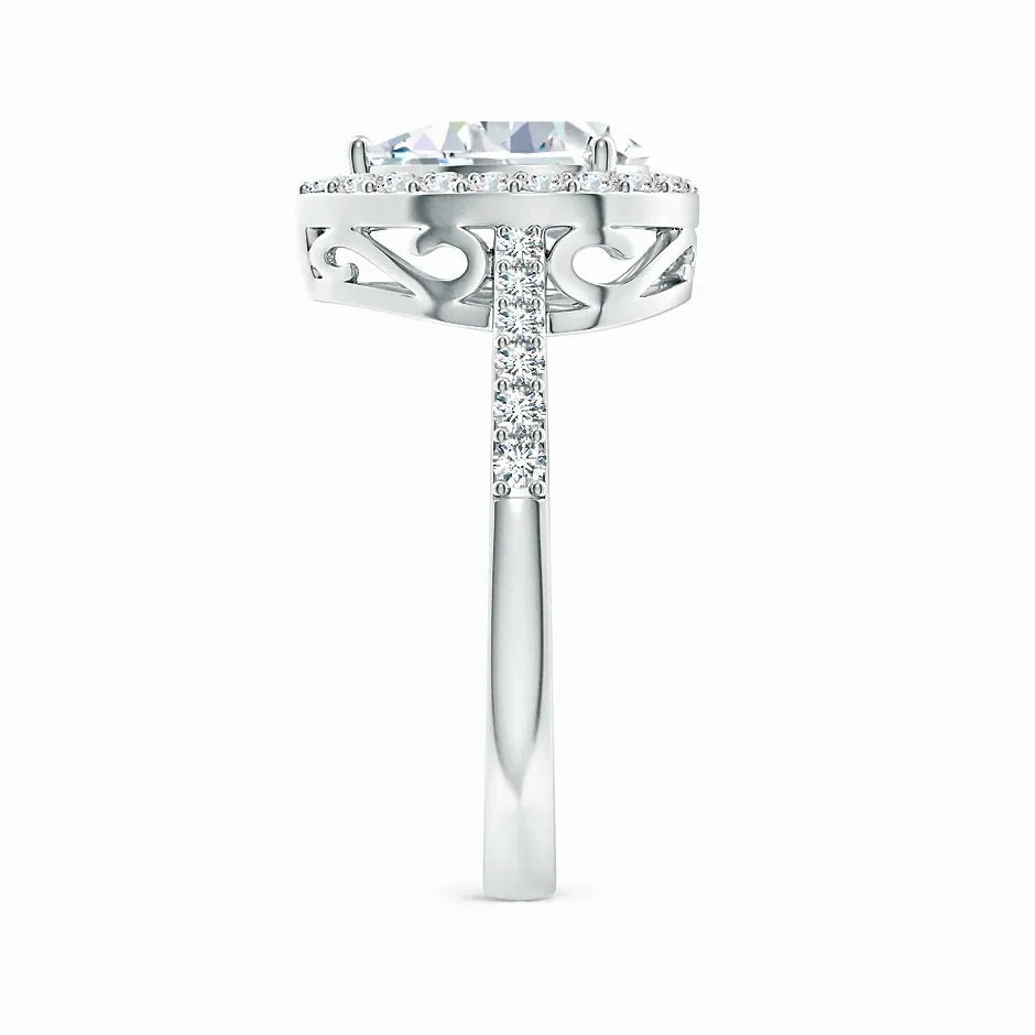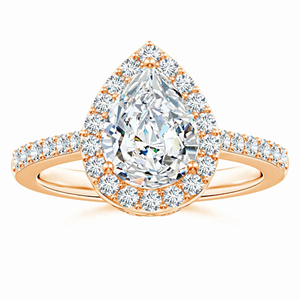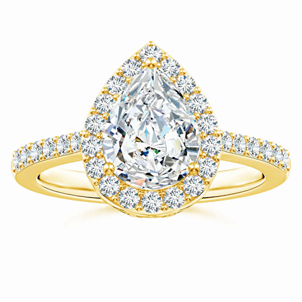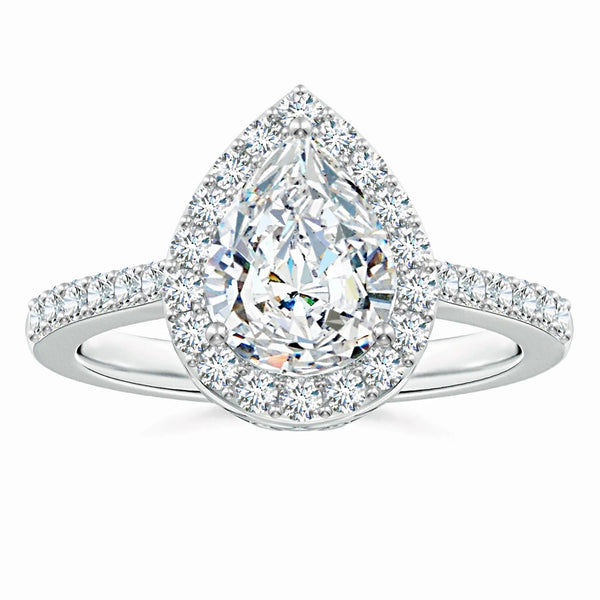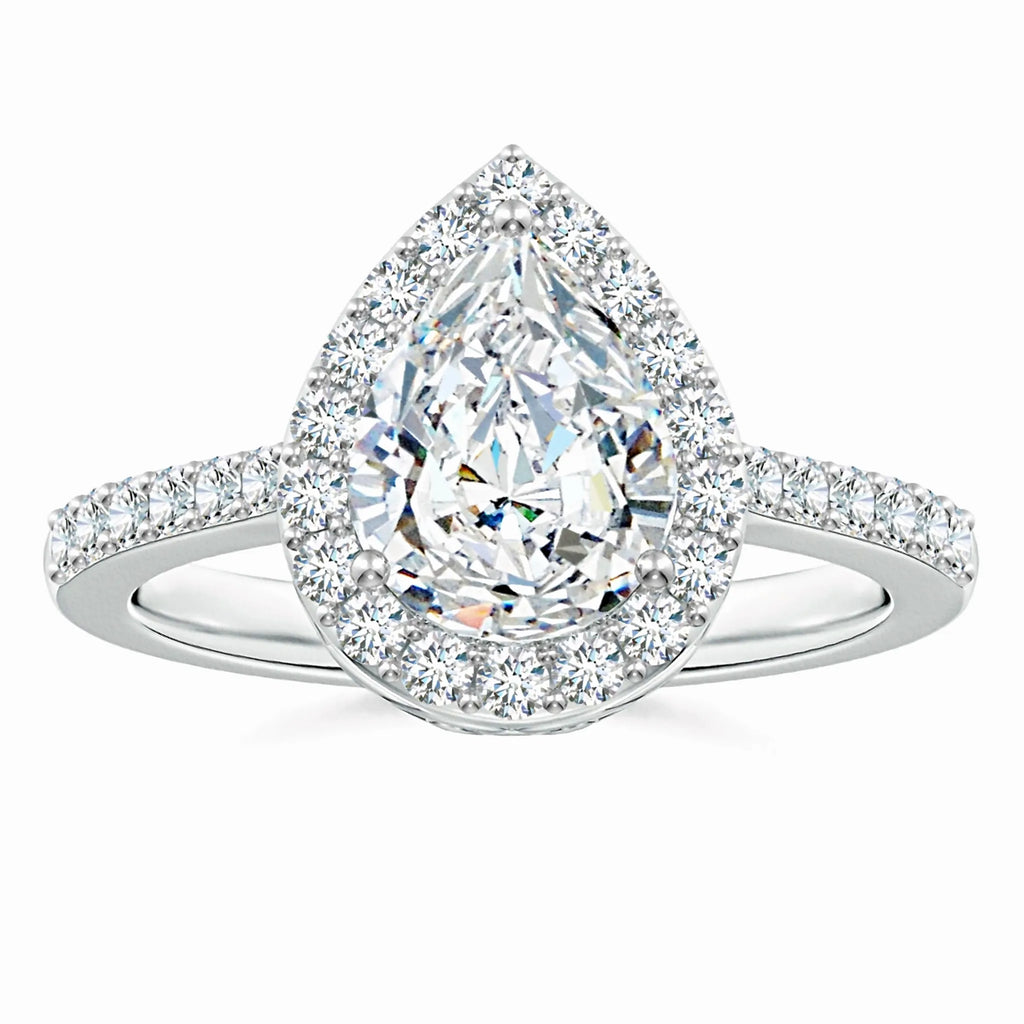 This prong-set pear-shaped lab-grown diamond ring features a stunning halo that enhances its brilliance and elegance. Crafted with precision, the lab-grown diamond offers exceptional clarity and sparkle while being an ethical and sustainable choice. The halo setting amplifies the center stone’s radiance, making it a sophisticated and timeless piece perfect for special occasions or everyday luxury.