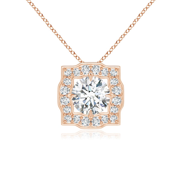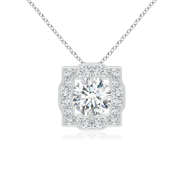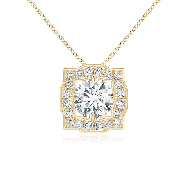 This pendant features a lab-grown round diamond set within an Art Deco-inspired halo design, combining vintage elegance with modern sustainability. The solitaire centerpiece is enhanced by a delicate halo that amplifies its brilliance, making it a refined choice for those who appreciate timeless style and ethical craftsmanship. Perfect for elevating any ensemble with subtle sophistication.