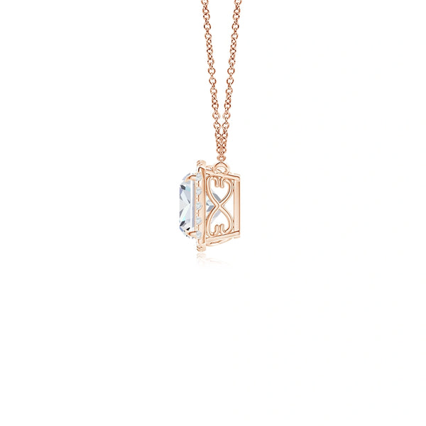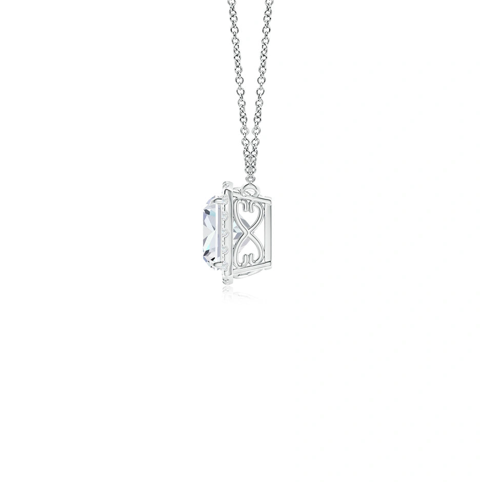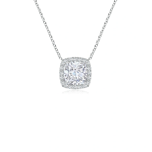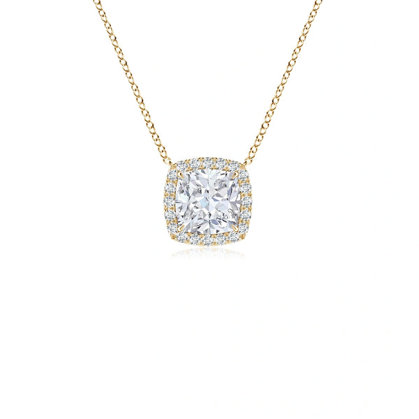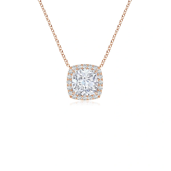 Elevate your collection with this Lab-Grown Cushion Diamond Halo Pendant, expertly crafted to showcase a brilliant cushion-cut diamond surrounded by a delicate halo of smaller stones. The intricate filigree detailing adds a timeless elegance, highlighting the pendant’s sophisticated design. Ethically sourced and expertly cut, this pendant offers exceptional sparkle and refined craftsmanship, perfect for those who appreciate sustainable luxury and classic beauty.