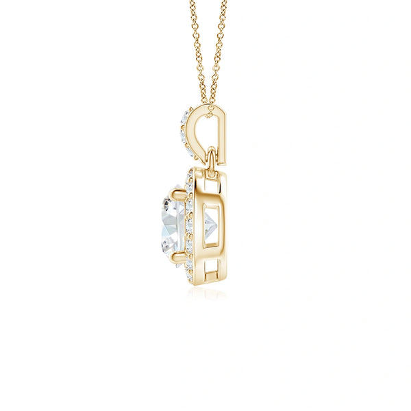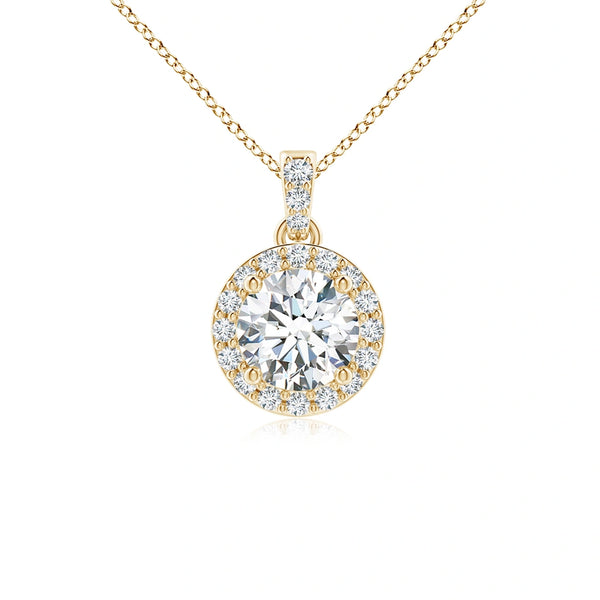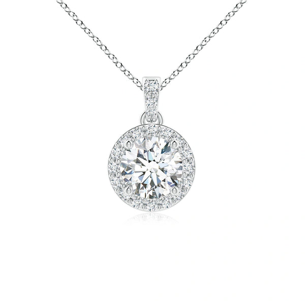 This lab-grown round diamond dangle pendant features a brilliant halo setting that enhances its sparkle and elegance. Crafted with precision, the pendant offers a sustainable and ethical alternative to mined diamonds without compromising on quality or brilliance. Its timeless design makes it a versatile accessory for both everyday wear and special occasions, reflecting expert craftsmanship and modern sophistication.