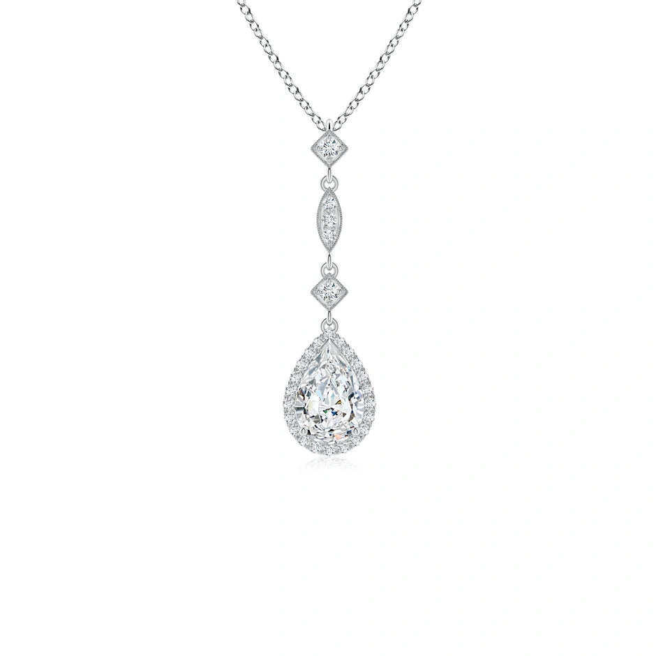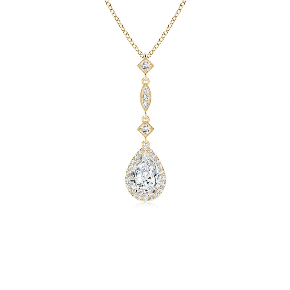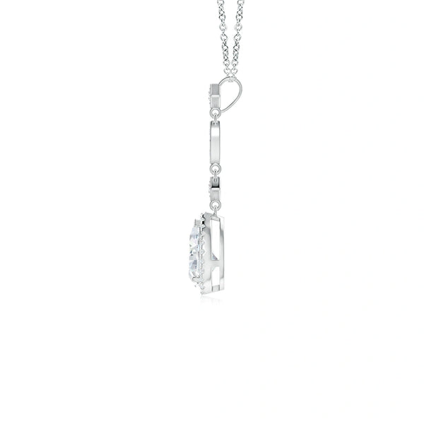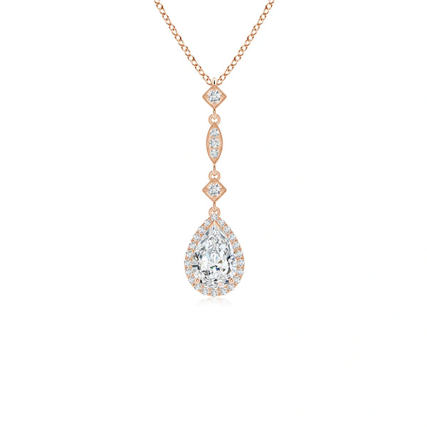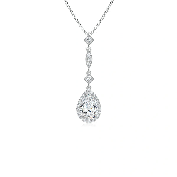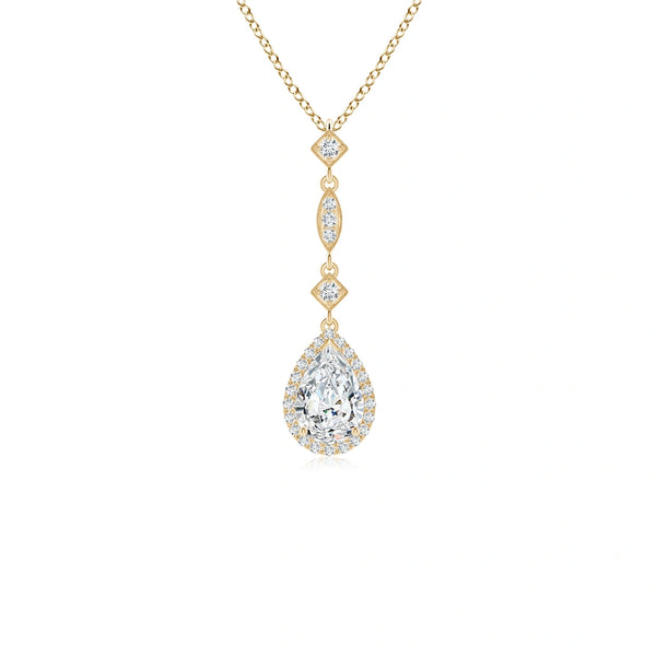 This prong-set teardrop pendant features a stunning lab-grown diamond surrounded by a delicate halo of accent stones, enhancing its brilliance and elegance. Expertly crafted to highlight the diamond’s clarity and sparkle, this piece offers a sustainable and ethical alternative without compromising on luxury. Perfect for adding a refined touch to any ensemble, it combines timeless design with modern craftsmanship.