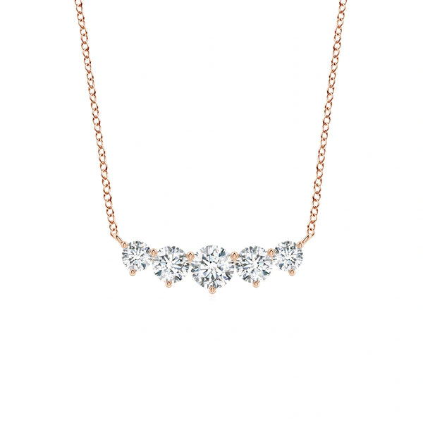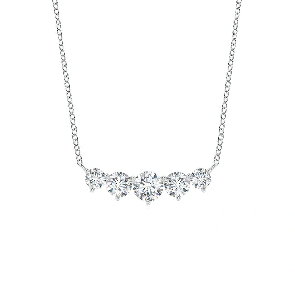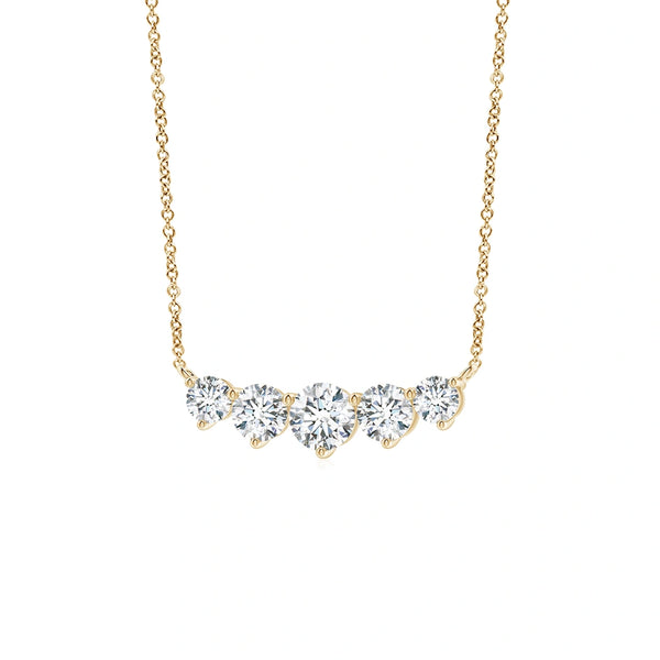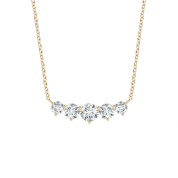 This Graduated Five Stone Round Lab-Grown Diamond Necklace features a sophisticated arrangement of five round lab-grown diamonds, each graduated in size to create a balanced and elegant look. Crafted with precision, the necklace offers the brilliance and clarity of natural diamonds while ensuring ethical sourcing and sustainability. Ideal for those seeking a refined accessory that combines timeless design with modern values, it enhances any outfit with subtle sparkle and expert craftsmanship.