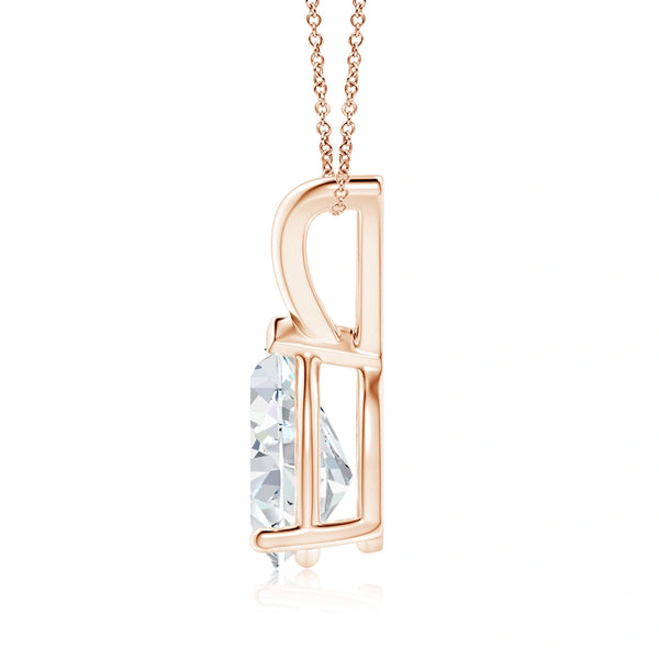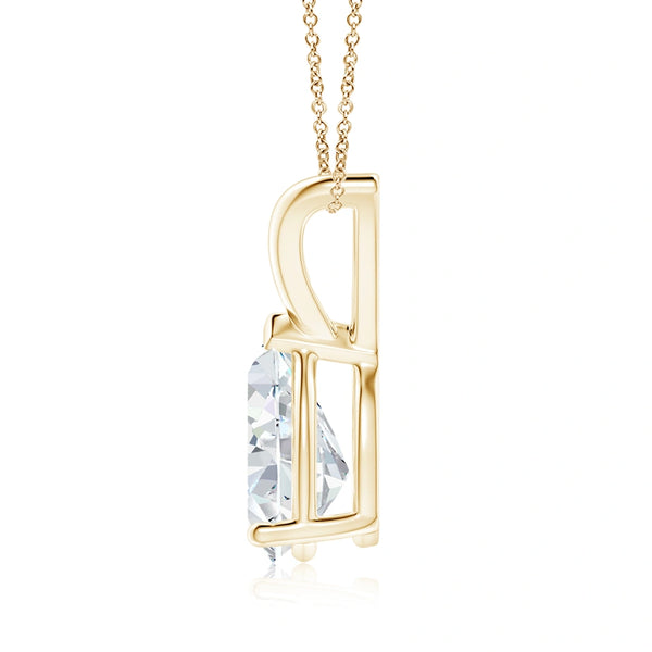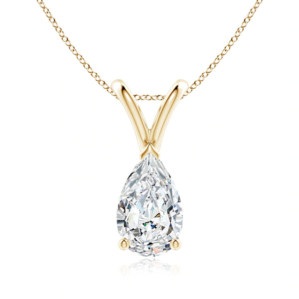 This Lab-Grown V-Bale Pear-Shaped Diamond Solitaire Pendant features a precisely cut pear-shaped diamond created through advanced laboratory processes, ensuring exceptional clarity and brilliance. The V-bale setting securely holds the solitaire diamond while allowing maximum light exposure for enhanced sparkle. Ideal for those seeking an ethical and sustainable alternative to mined diamonds, this pendant combines timeless elegance with modern craftsmanship, making it a refined choice for everyday wear or special occasions.