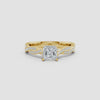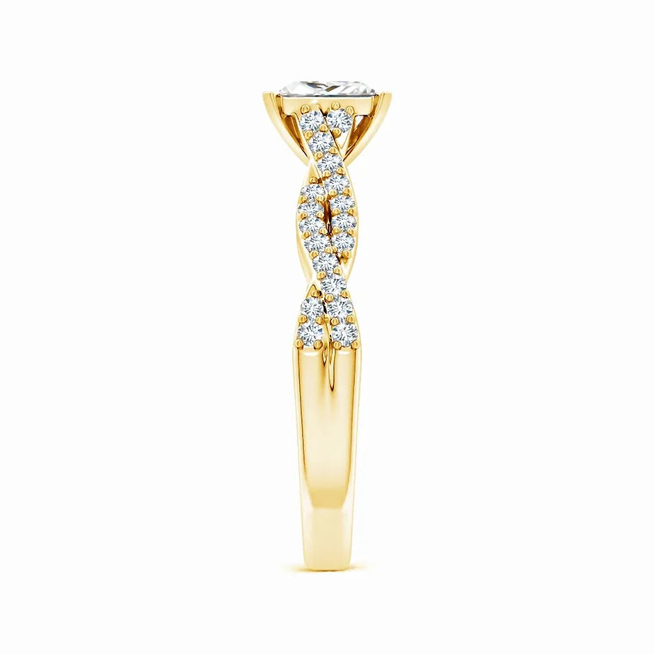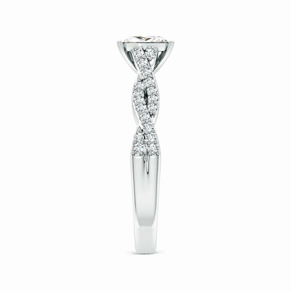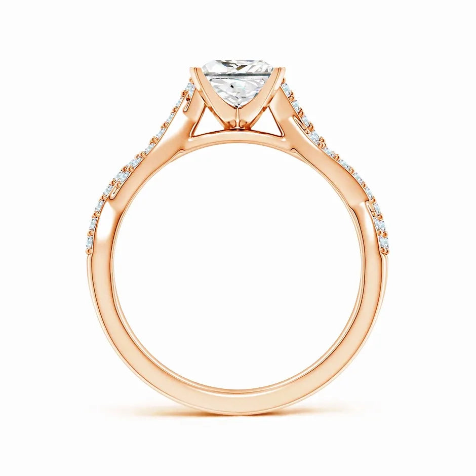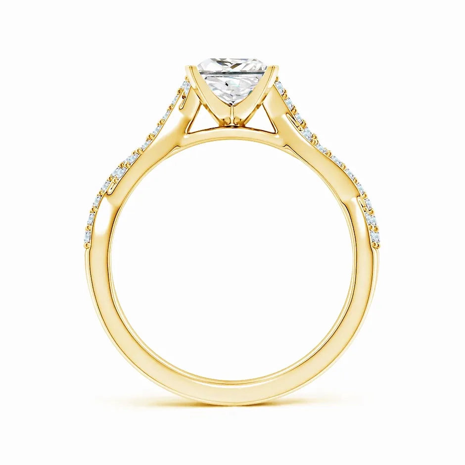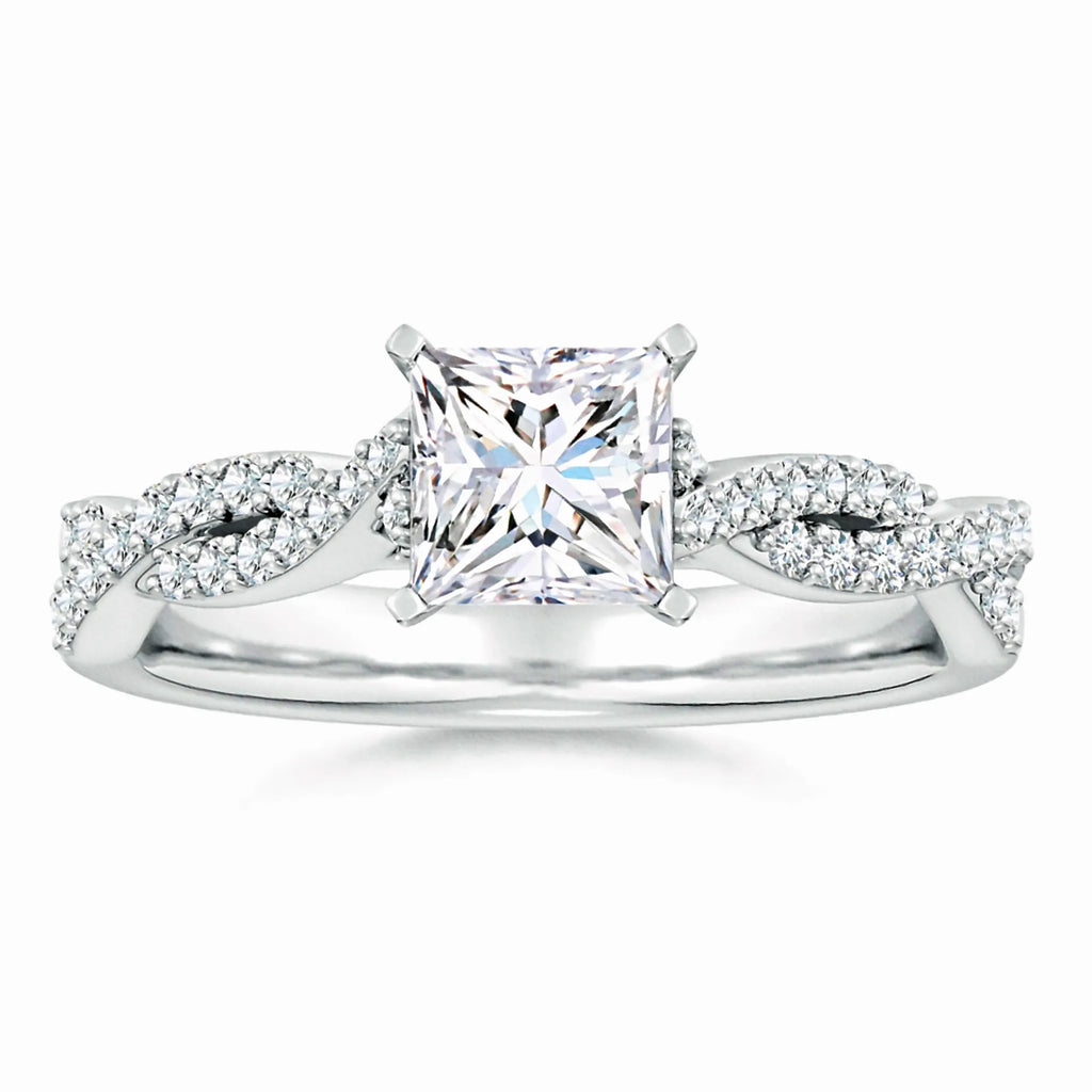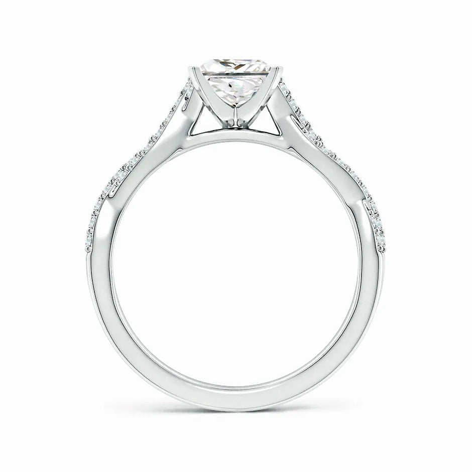 This engagement ring features a lab-grown princess-cut diamond set in a peg head design, offering exceptional brilliance and ethical sourcing. The elegant twist shank adds a modern, sophisticated touch while enhancing comfort and durability. Perfect for those seeking a sustainable yet stunning symbol of commitment.