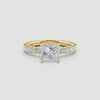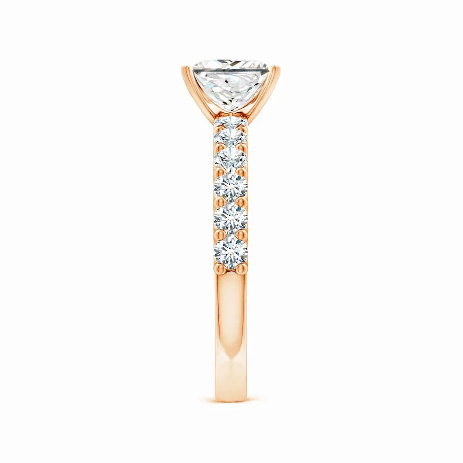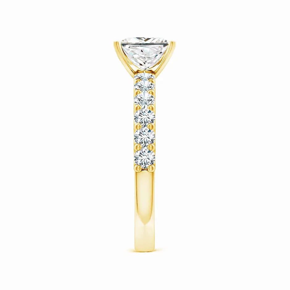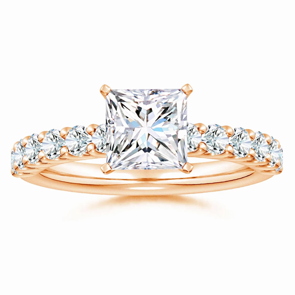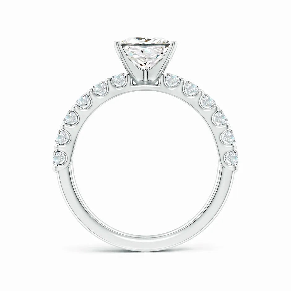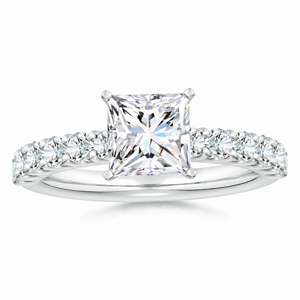 This exquisite engagement ring features a lab-grown princess-cut diamond solitaire, renowned for its brilliance and modern elegance. Accentuated by delicate diamond side stones, it offers a refined sparkle that enhances the centerpiece without overpowering it. Crafted with precision, this ring combines ethical sourcing with timeless design, making it an ideal choice for those seeking both beauty and sustainability in a symbol of commitment.