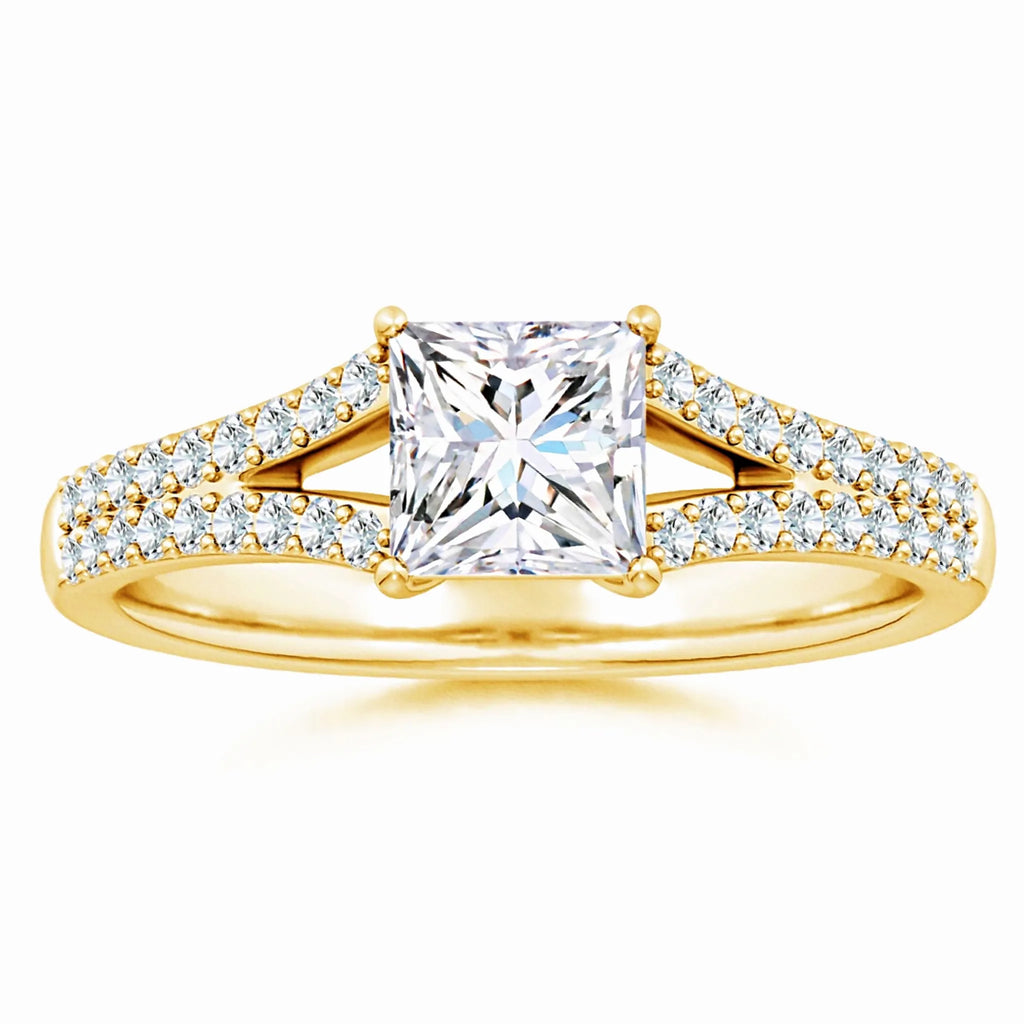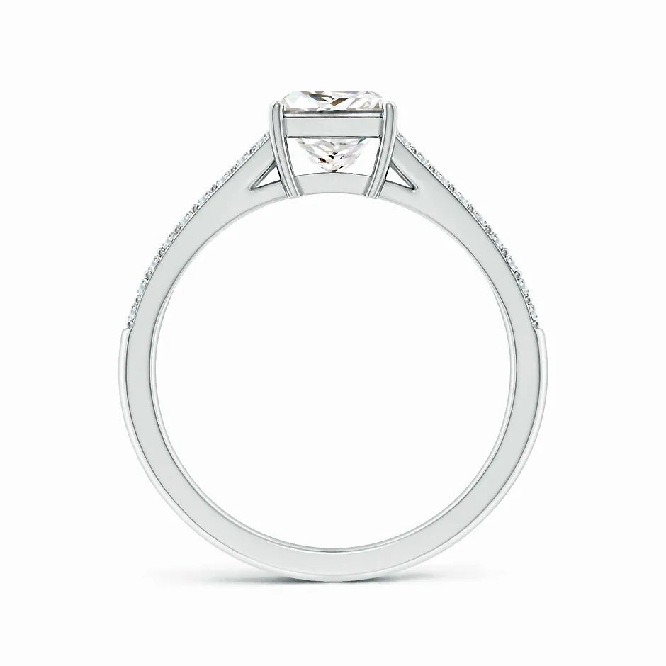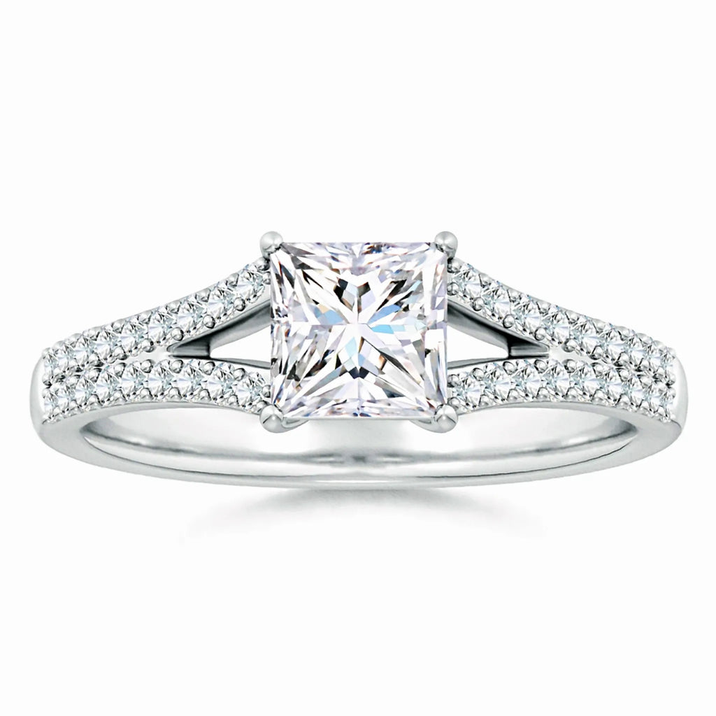 This engagement ring features a lab-grown solitaire princess-cut diamond, renowned for its sharp, modern lines and exceptional brilliance. The split shank design enhances the ring’s elegance while providing a secure setting that highlights the diamond’s clarity and fire. Crafted with precision, this ring offers a sustainable and ethical choice without compromising on quality or style, making it an expert selection for a timeless symbol of commitment.