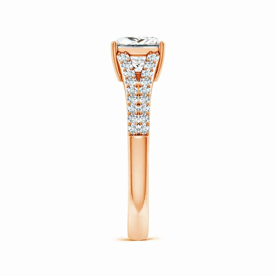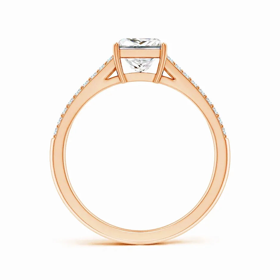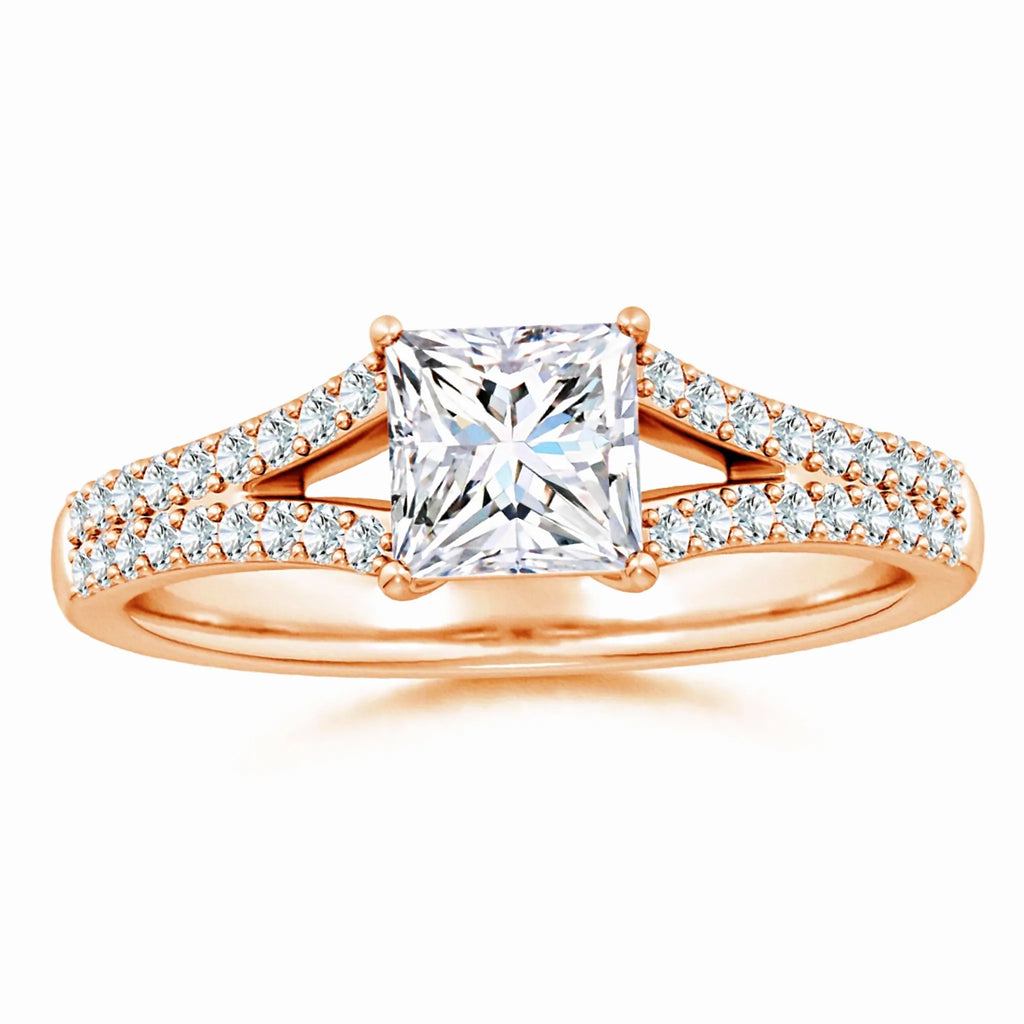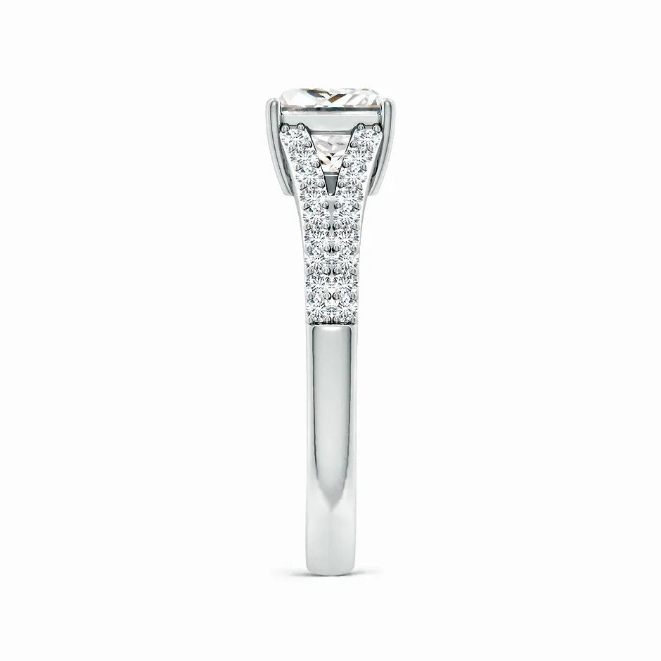 This engagement ring features a lab-grown solitaire princess-cut diamond, renowned for its sharp, modern lines and exceptional brilliance. The split shank design enhances the ring’s elegance while providing a secure setting that highlights the diamond’s clarity and fire. Crafted with precision, this ring offers a sustainable and ethical choice without compromising on quality or style, making it an expert selection for a timeless symbol of commitment.