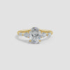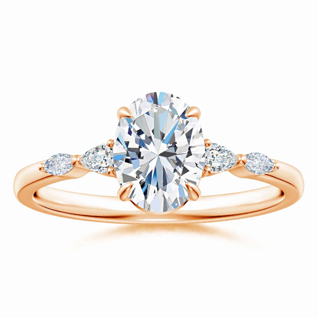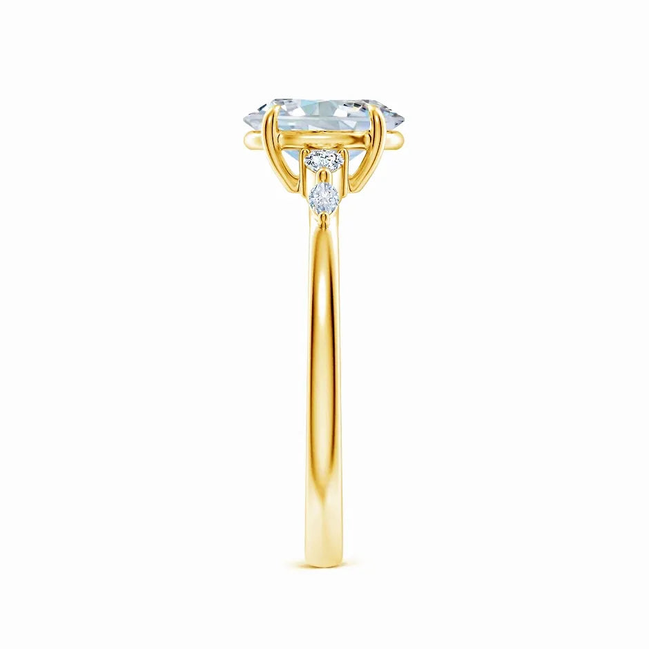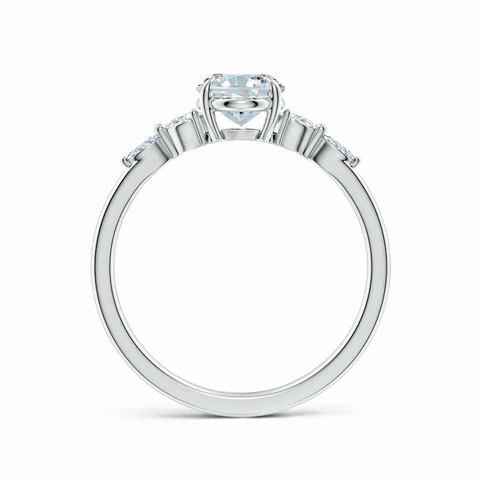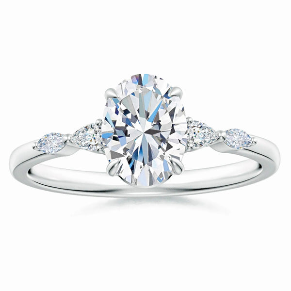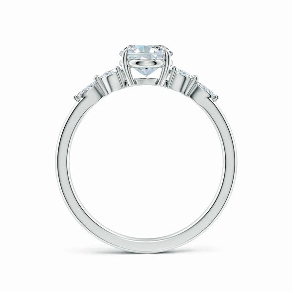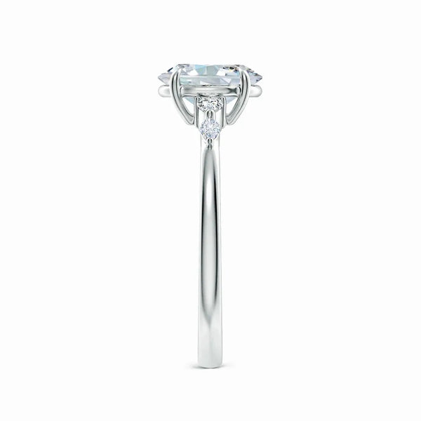 This engagement ring features a claw-set oval lab-grown diamond as the centerpiece, flanked by meticulously set side stones that enhance its brilliance. Crafted with precision, the design highlights the diamond’s clarity and fire while ensuring secure placement. Ideal for those seeking an ethically sourced, expertly crafted symbol of commitment that combines timeless elegance with modern sustainability.
