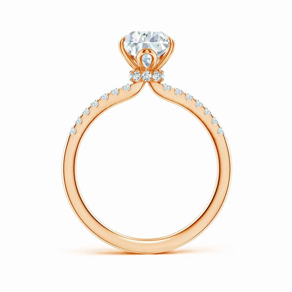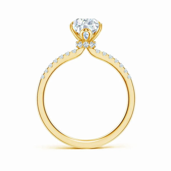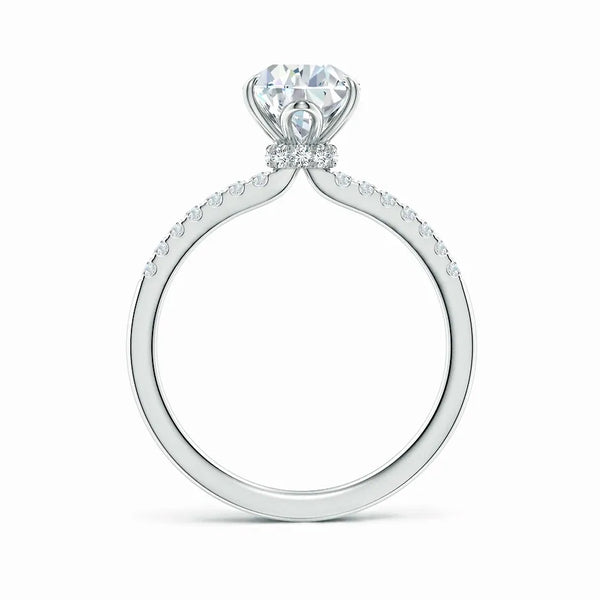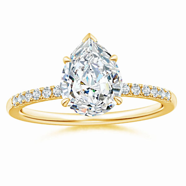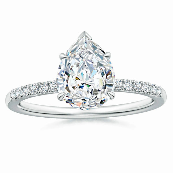 This engagement ring features a lab-grown pear-shaped diamond, expertly cut to maximize brilliance and fire. The hidden halo design subtly enhances the center stone’s sparkle while maintaining an elegant, refined look. Crafted with precision, this ring offers a sustainable and ethical choice without compromising on quality or beauty, making it a sophisticated symbol of commitment.