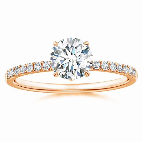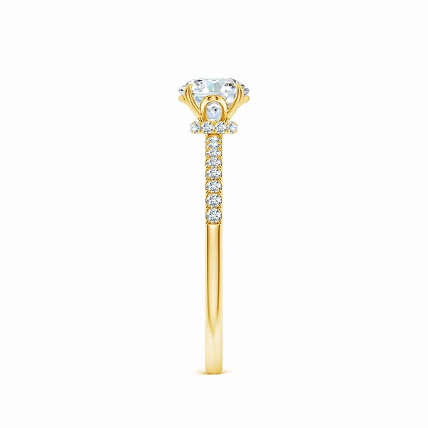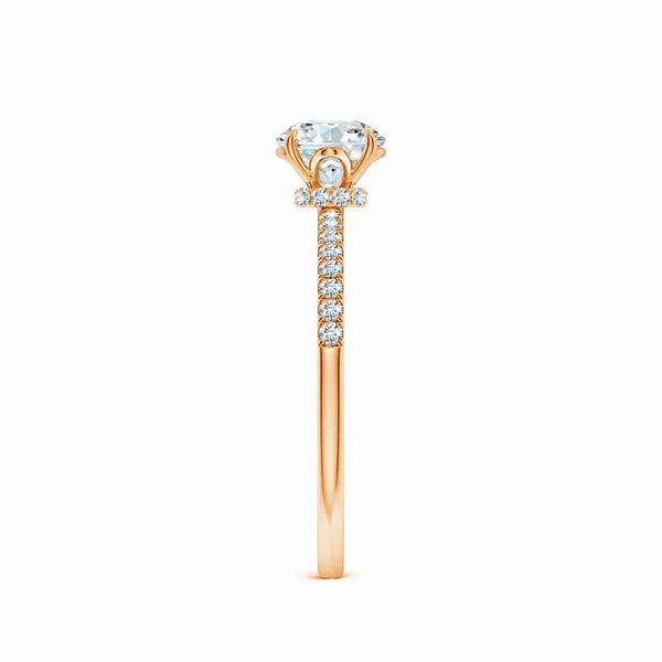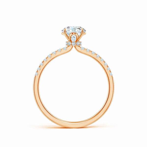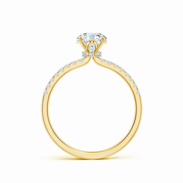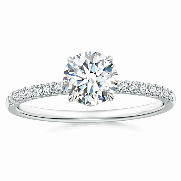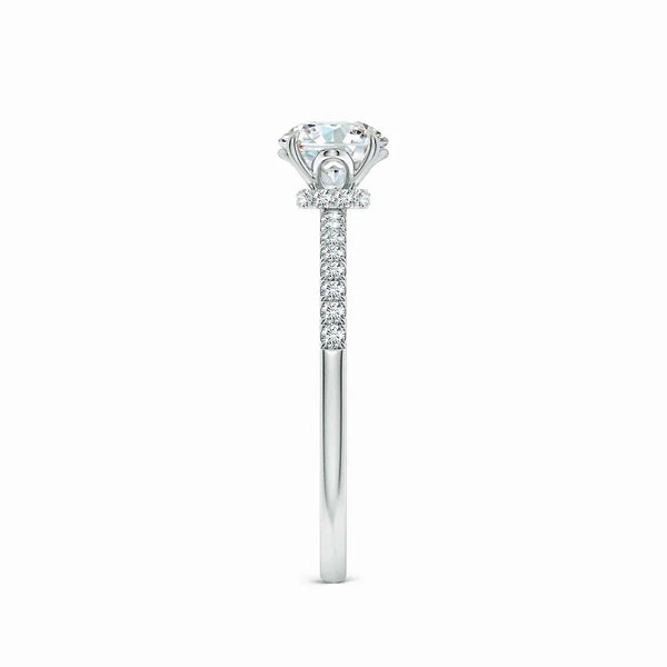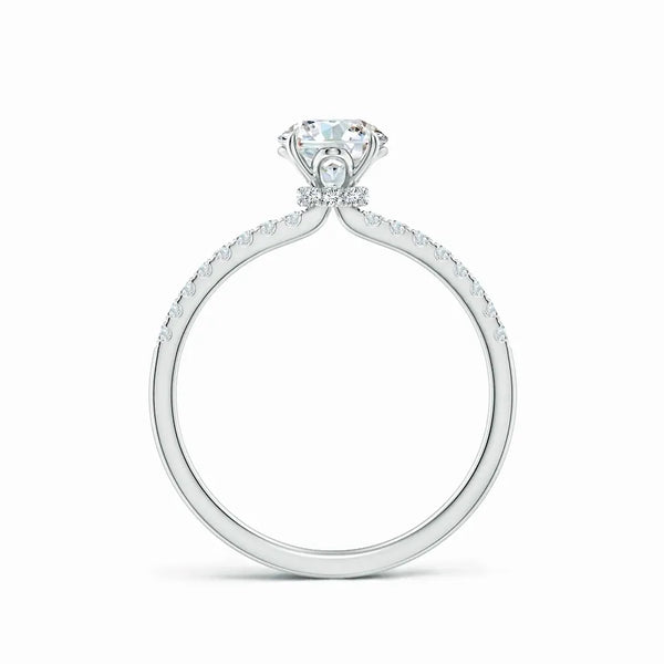 This Lab Grown Round Diamond Hidden Halo Engagement Ring features a meticulously crafted design that enhances the central diamond's brilliance with a subtle hidden halo setting. The lab-grown round diamond offers exceptional clarity and sparkle, providing an ethical and sustainable choice without compromising on quality. Expertly designed to highlight elegance and sophistication, this ring is a timeless symbol of commitment and refined taste.