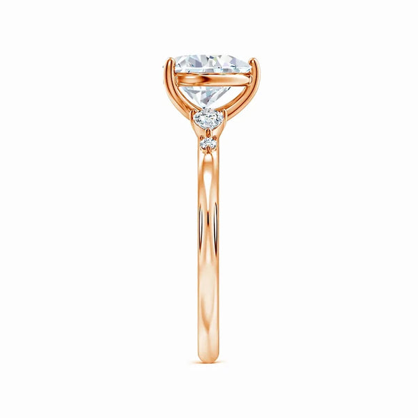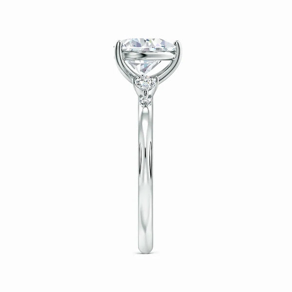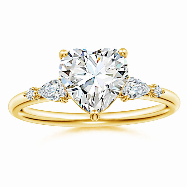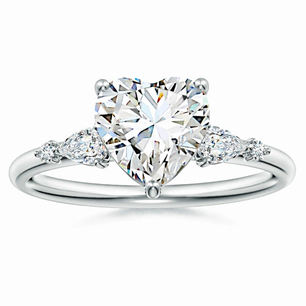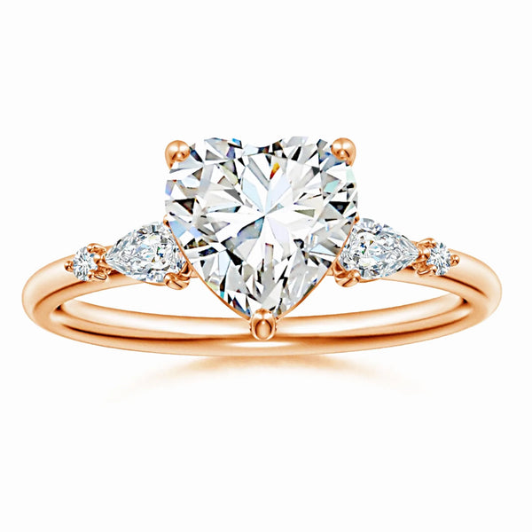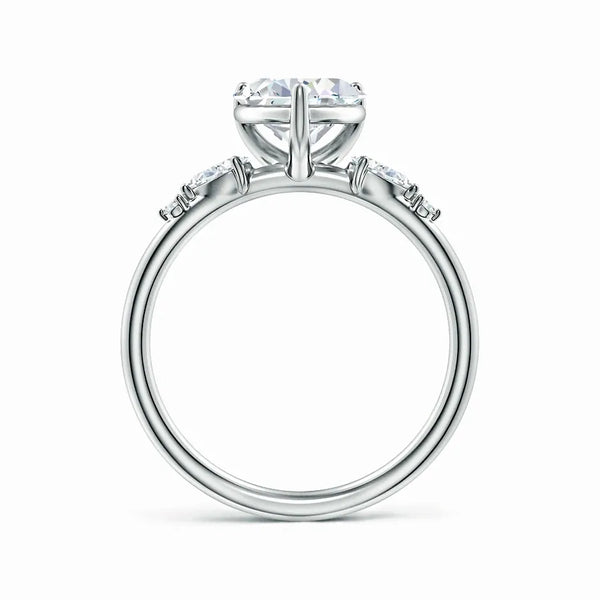 This prong-set engagement ring features heart-shaped lab-grown diamond side stones, combining ethical sourcing with expert craftsmanship. The prong setting securely holds each diamond, maximizing brilliance and showcasing the unique heart shape that symbolizes love and commitment. Ideal for those seeking a sophisticated and environmentally conscious choice, this ring balances timeless elegance with modern sustainability.