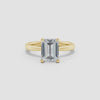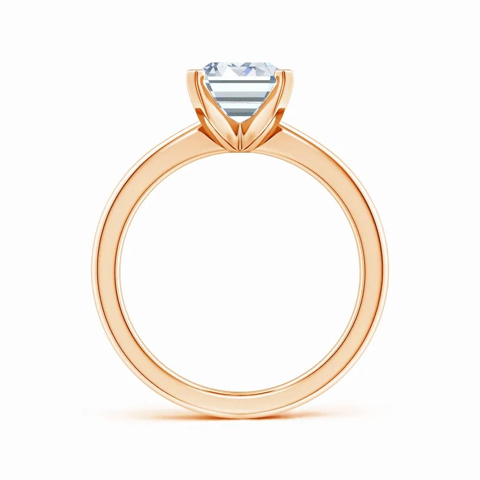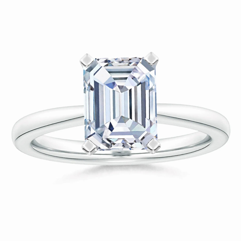 This solitaire engagement ring features a lab-grown emerald cut diamond set in a reverse tapered setting, enhancing the stone’s brilliance and elegance. Crafted with precision, the design offers a modern yet timeless appeal, highlighting the diamond’s clarity and geometric beauty. Ideal for those seeking an ethical and sophisticated choice, this ring combines expert craftsmanship with sustainable luxury.