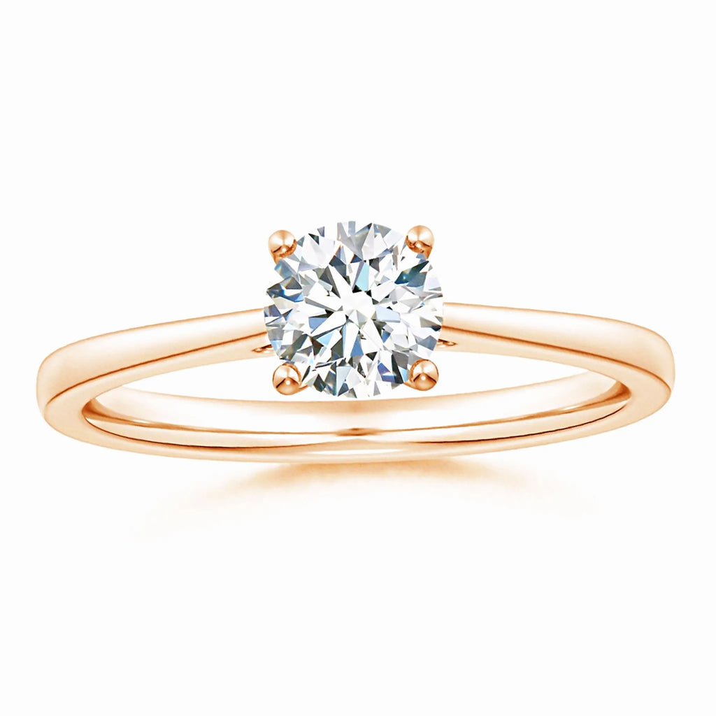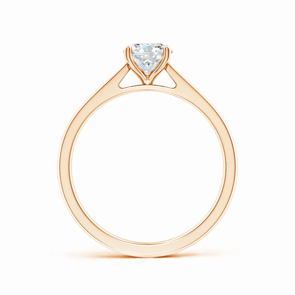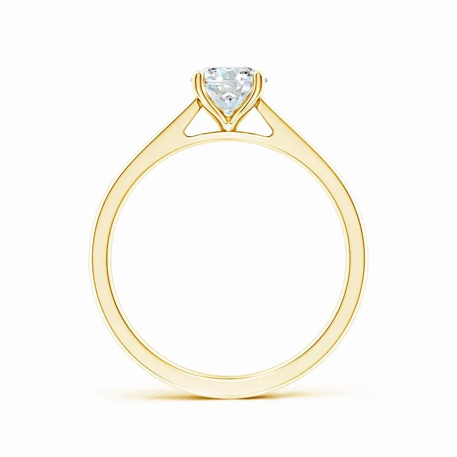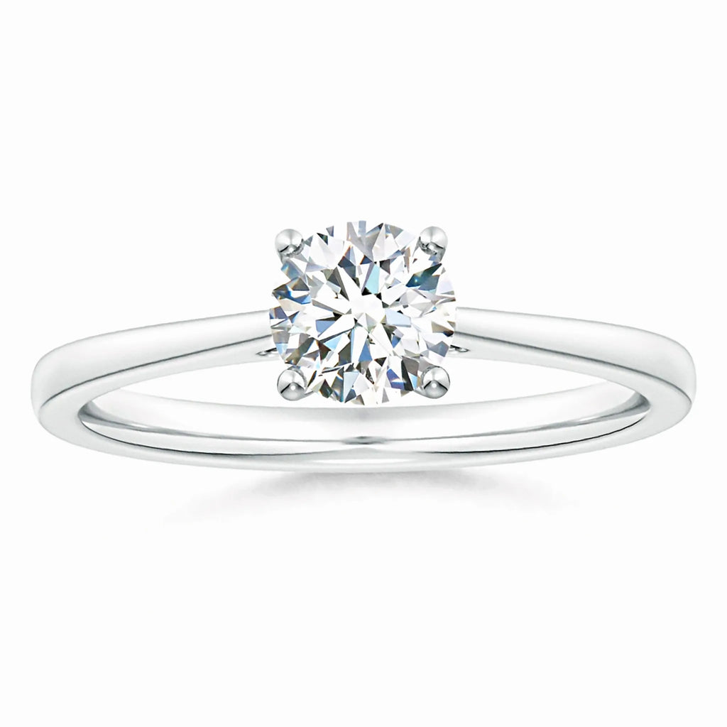 This engagement ring features a round lab-grown diamond securely held in a prong setting, enhancing its brilliance and fire. The reverse tapered band elegantly directs attention to the center stone, while the cathedral setting adds height and sophistication. Crafted with precision, this design balances modern sustainability with timeless elegance, making it an expert choice for a meaningful symbol of commitment.