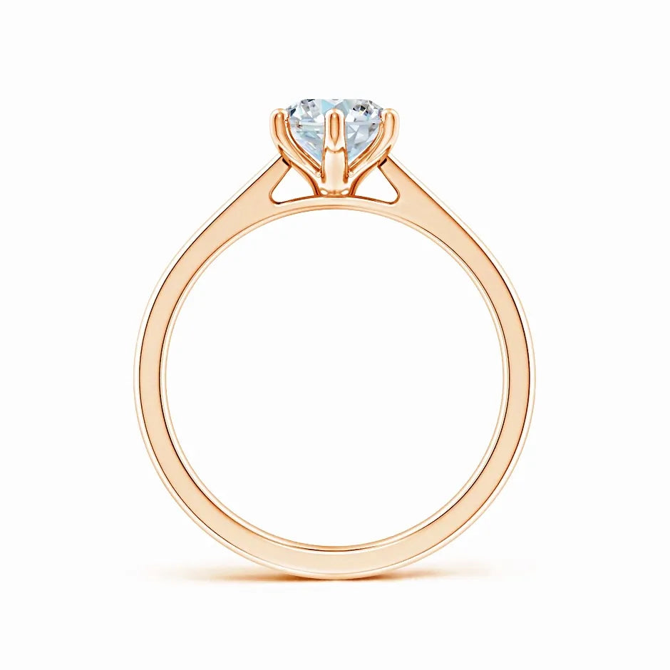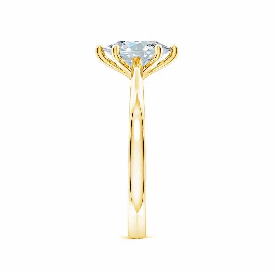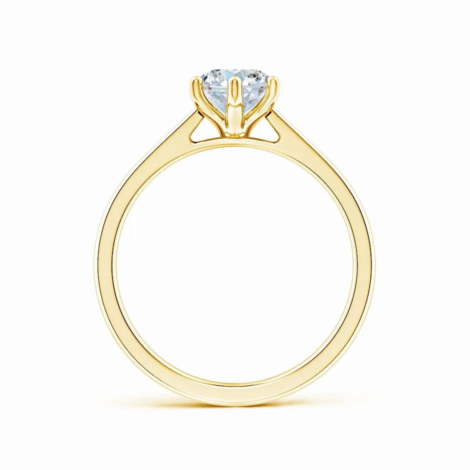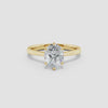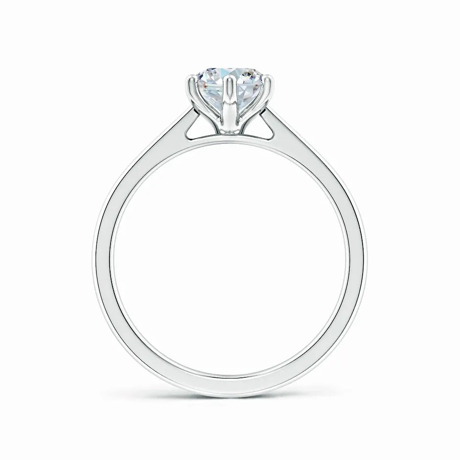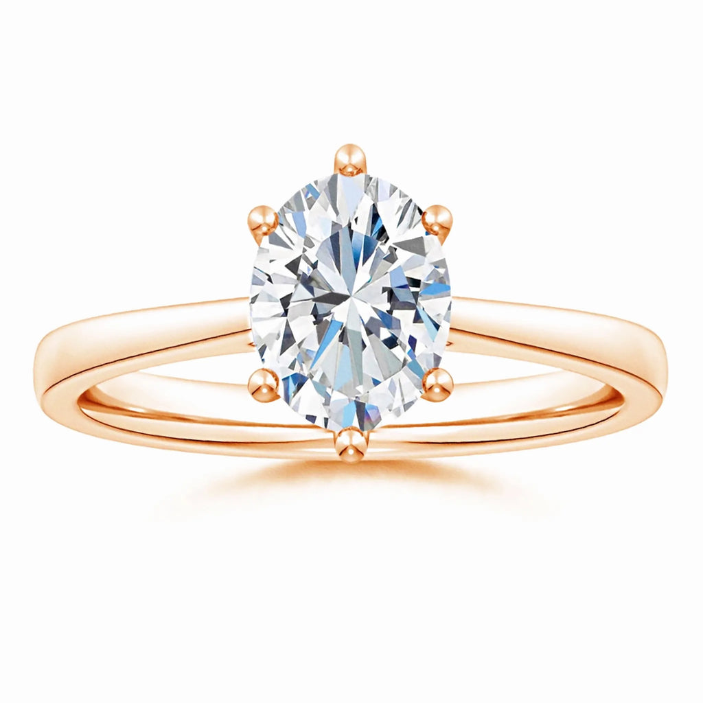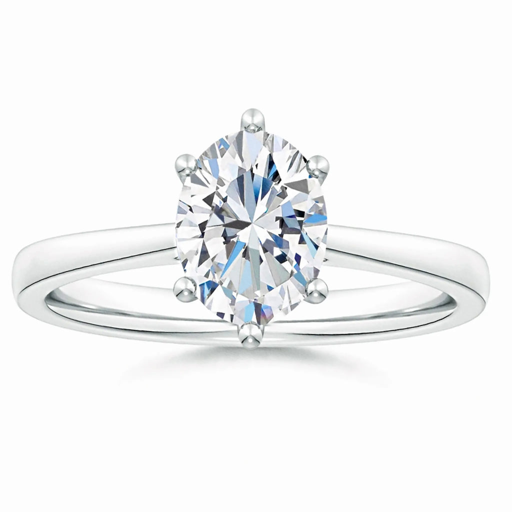 This engagement ring features a six-prong setting that securely holds an oval lab-grown diamond, showcasing its brilliance and elegance. The reverse tapered band seamlessly leads to a cathedral-style setting, elevating the diamond for maximum light reflection. Crafted with precision, this design combines modern sustainability with timeless sophistication, making it an expert choice for those seeking both ethical and exquisite craftsmanship.
