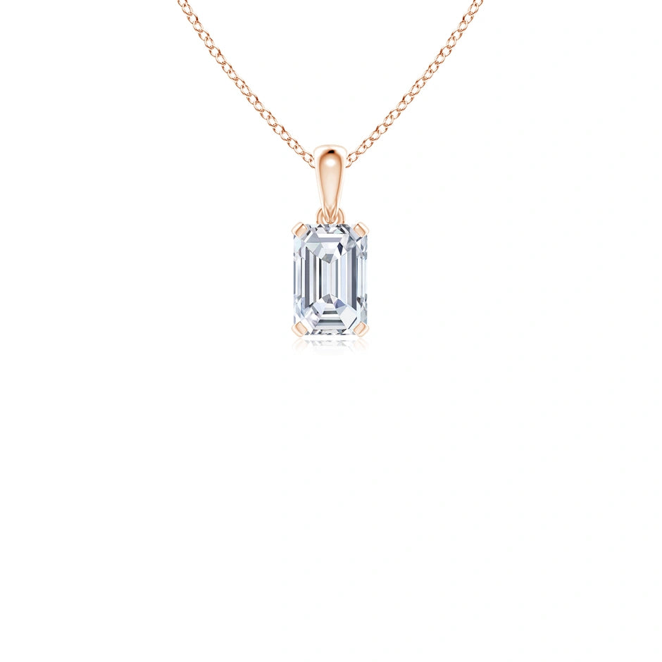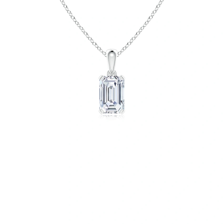 This prong-set emerald-cut lab-grown diamond solitaire pendant showcases a precisely cut diamond that maximizes brilliance and clarity. Crafted with expert attention to detail, the pendant offers a sustainable alternative to mined diamonds without compromising on quality or elegance. Its classic solitaire design ensures timeless appeal, making it a refined choice for those seeking both ethical sourcing and sophisticated style.