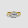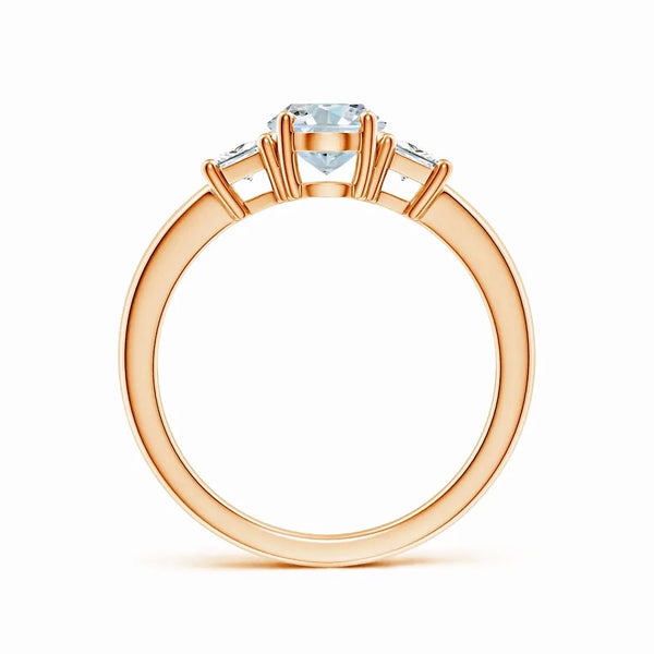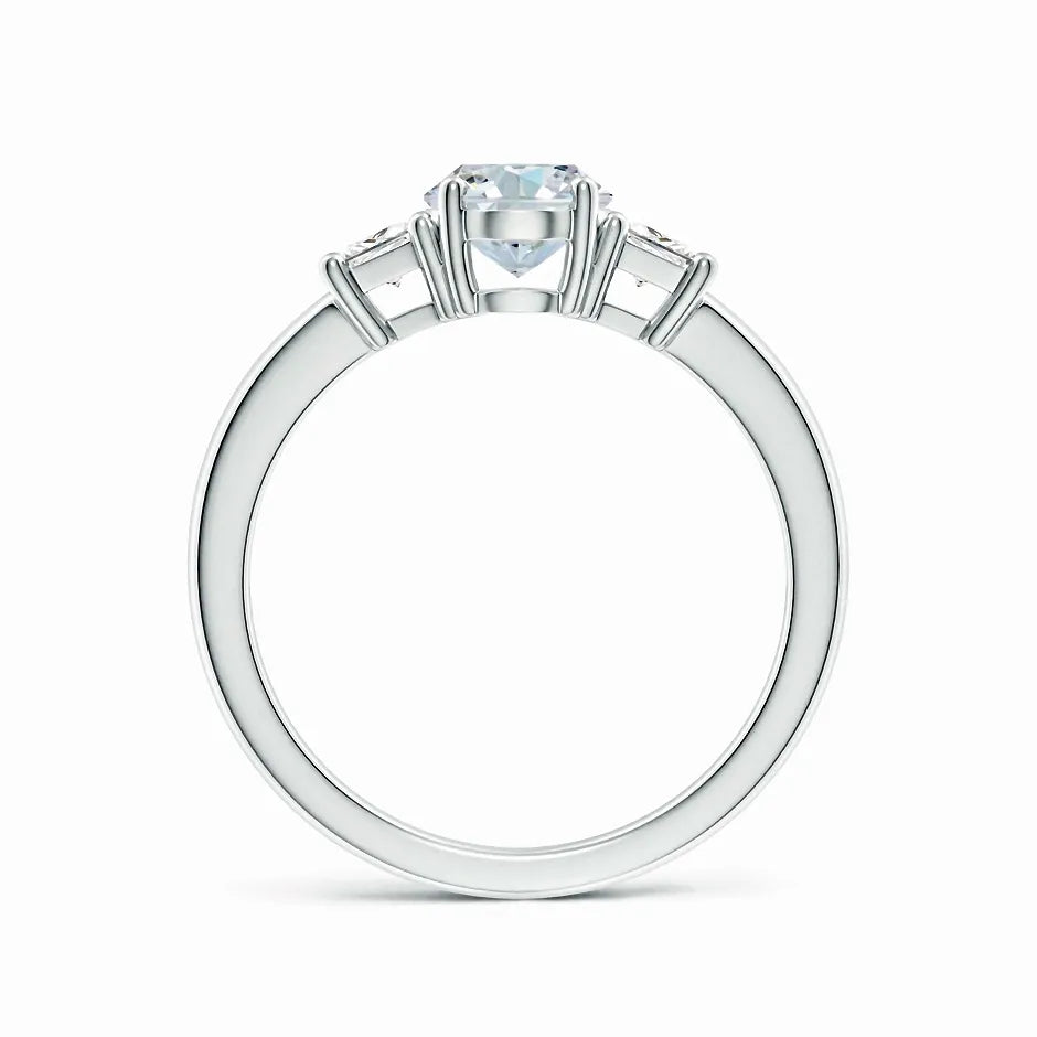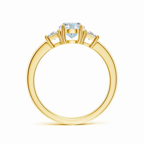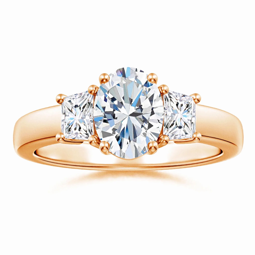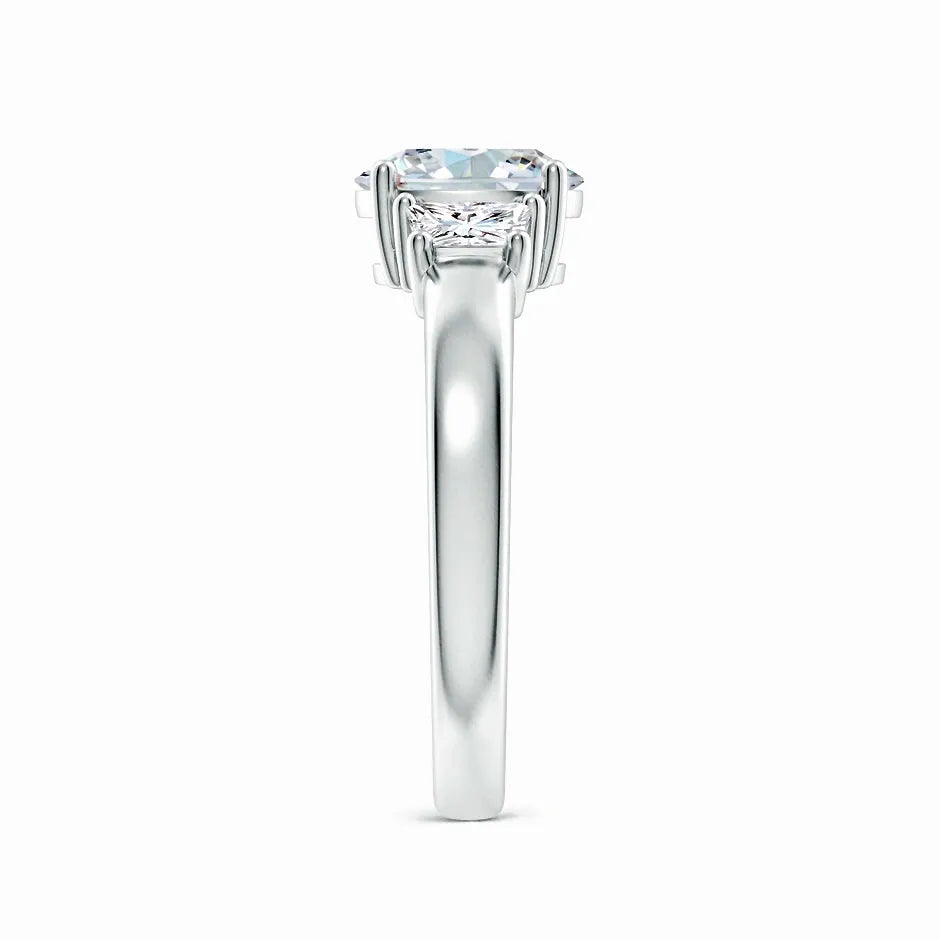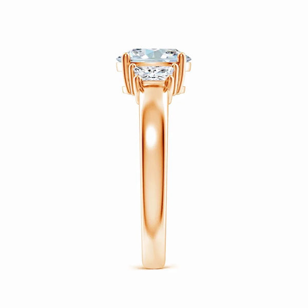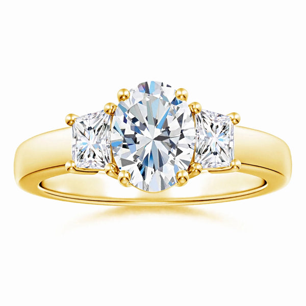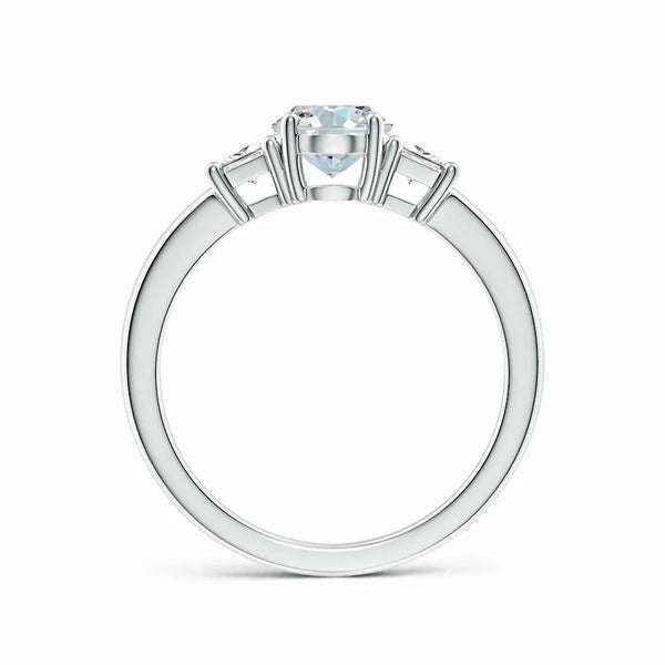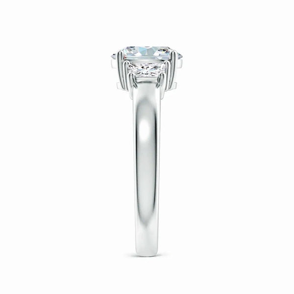 This elegant engagement ring features a classic oval lab-grown diamond flanked by two trapezoid-shaped lab-grown diamonds, creating a timeless three-stone design. Crafted with precision, it offers exceptional brilliance and ethical sourcing, making it a sophisticated choice for those seeking both beauty and sustainability in their symbol of commitment.