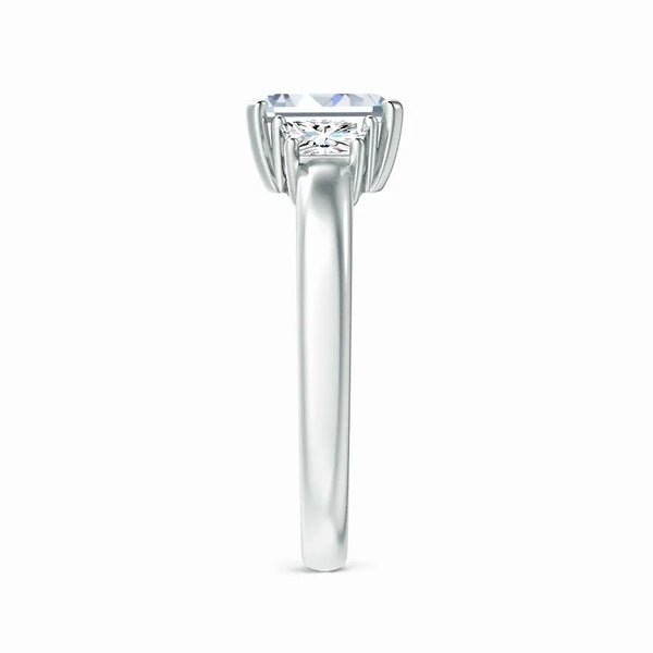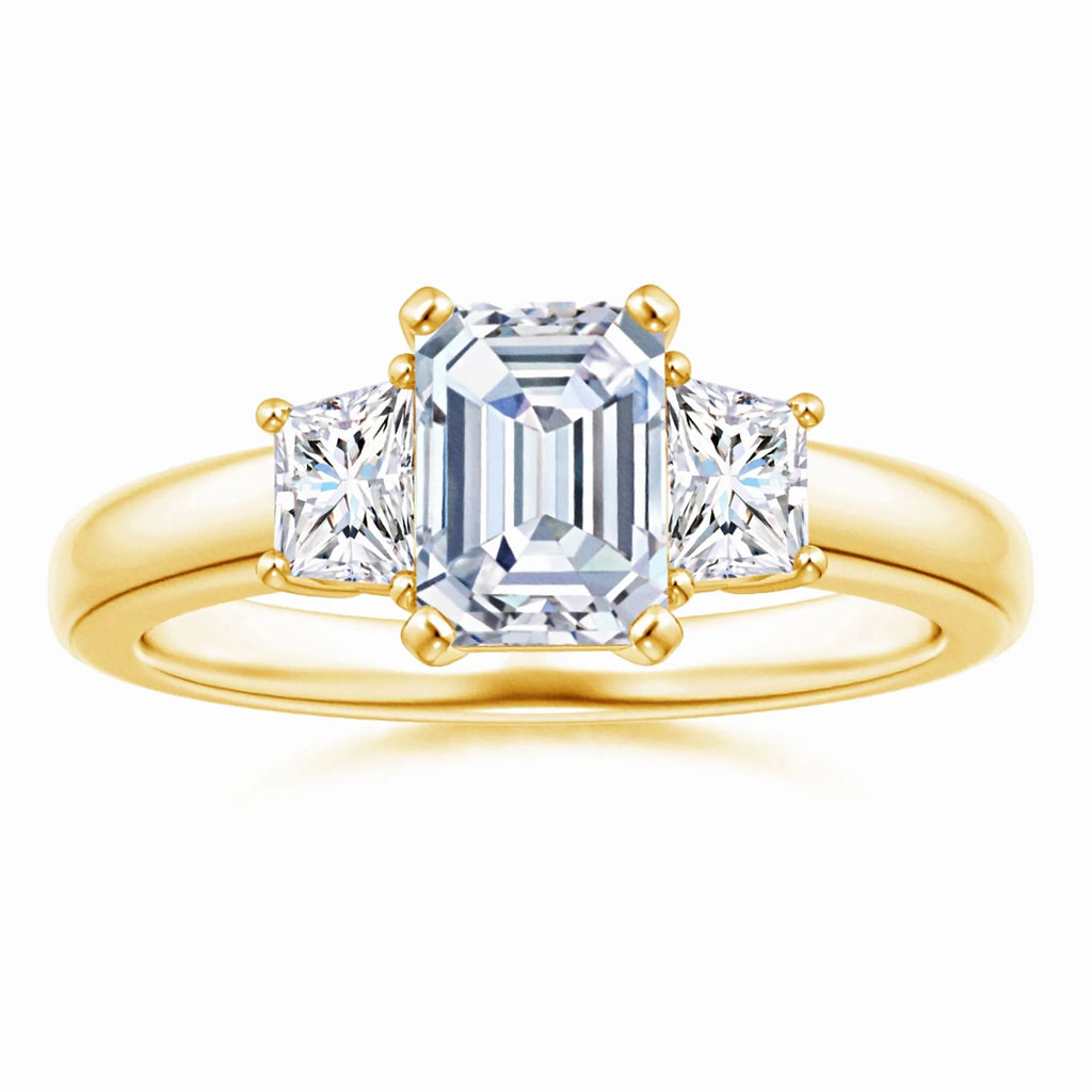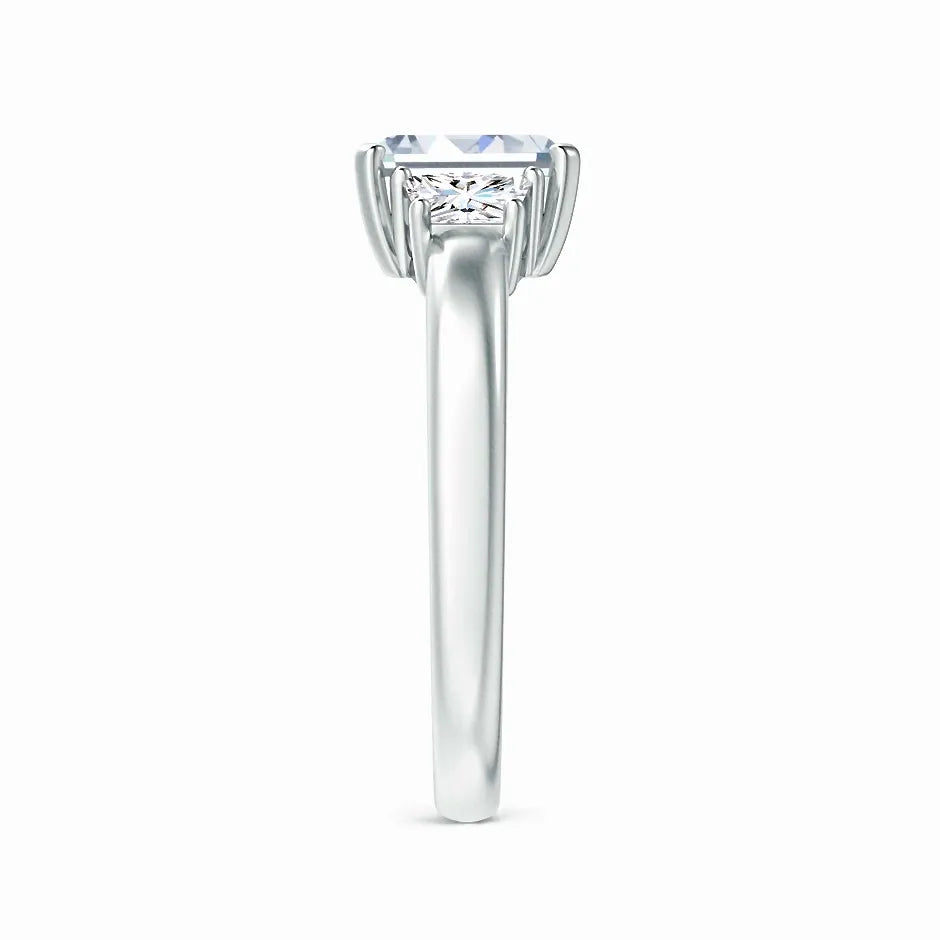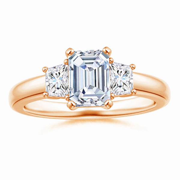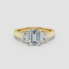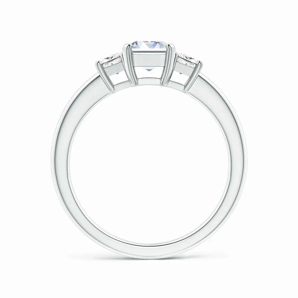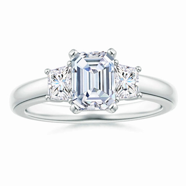 This exquisite three-stone ring features a lab-grown emerald-cut diamond flanked by trapezoid-shaped diamonds, showcasing precision craftsmanship and sustainable luxury. The lab-grown stones offer exceptional clarity and brilliance, providing an ethical alternative without compromising on quality. Ideal for those seeking a sophisticated design with a modern, responsible edge.