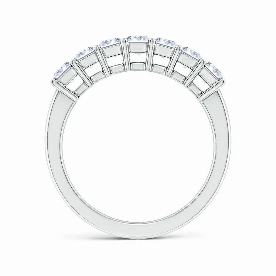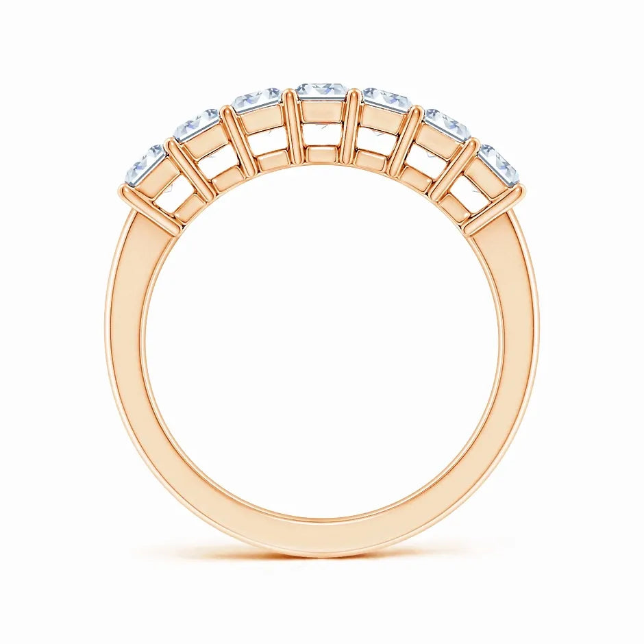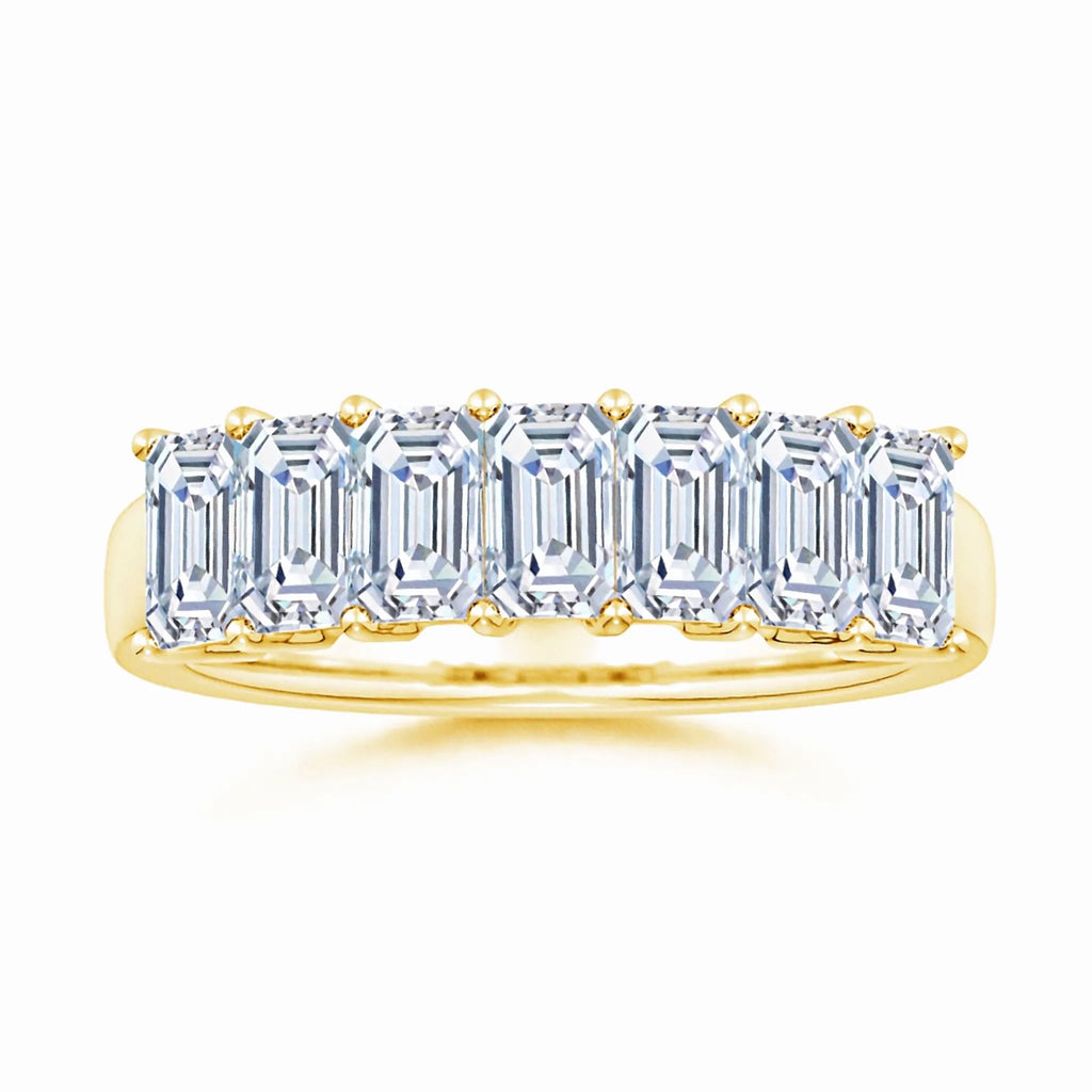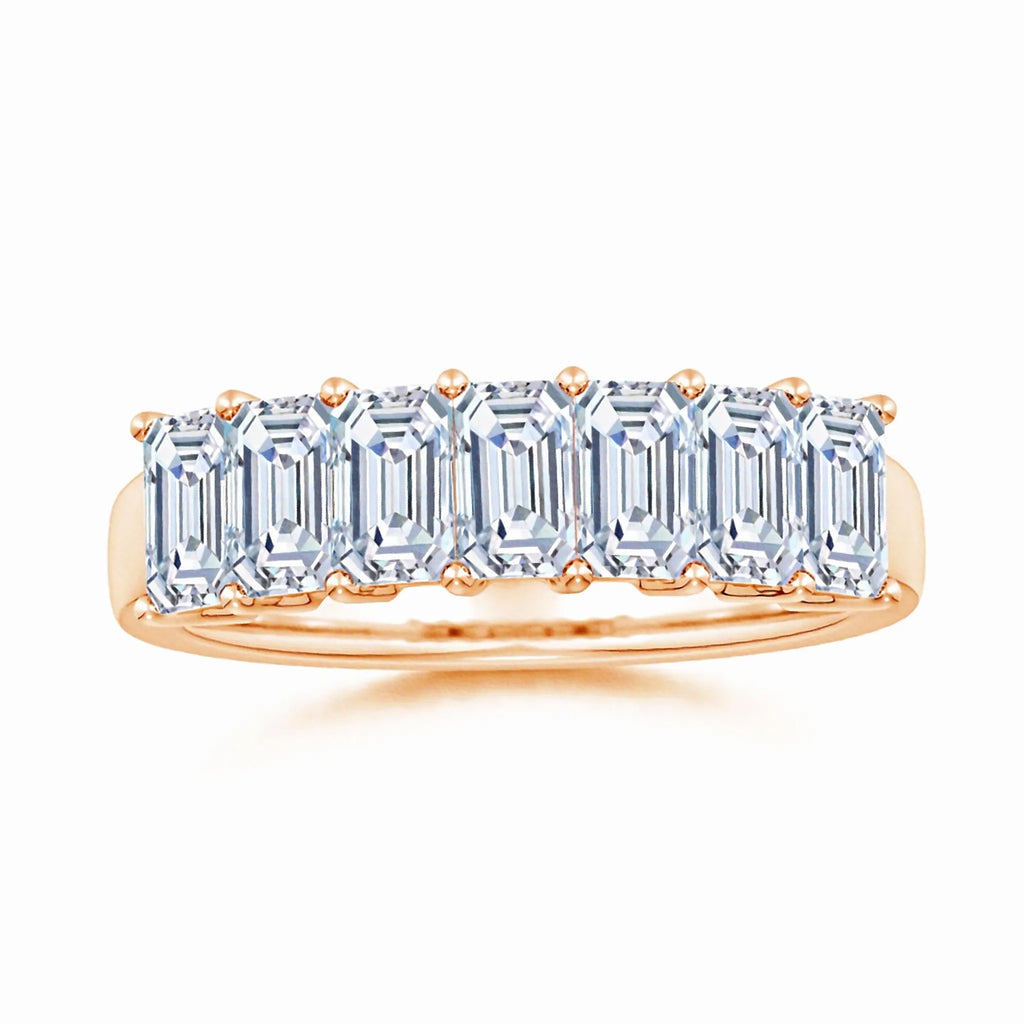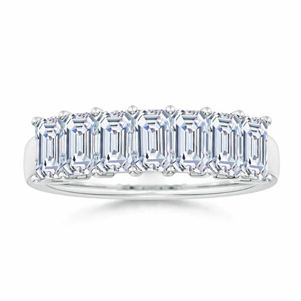 This wedding ring features seven lab-grown, emerald-cut diamonds expertly prong-set to maximize brilliance and clarity. Designed for lasting elegance, the precise arrangement highlights each stone’s unique facets, offering a sophisticated and sustainable choice for your special day. Crafted with attention to detail, this ring combines timeless style with ethical craftsmanship.