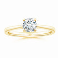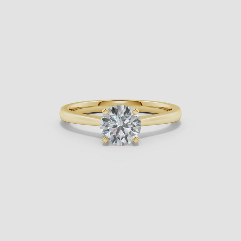 This engagement ring features a round lab-grown diamond securely held in a prong setting, enhancing its brilliance and fire. The reverse tapered band elegantly directs attention to the center stone, while the cathedral setting adds height and sophistication. Crafted with precision, this design balances modern sustainability with timeless elegance, making it an expert choice for a meaningful symbol of commitment.